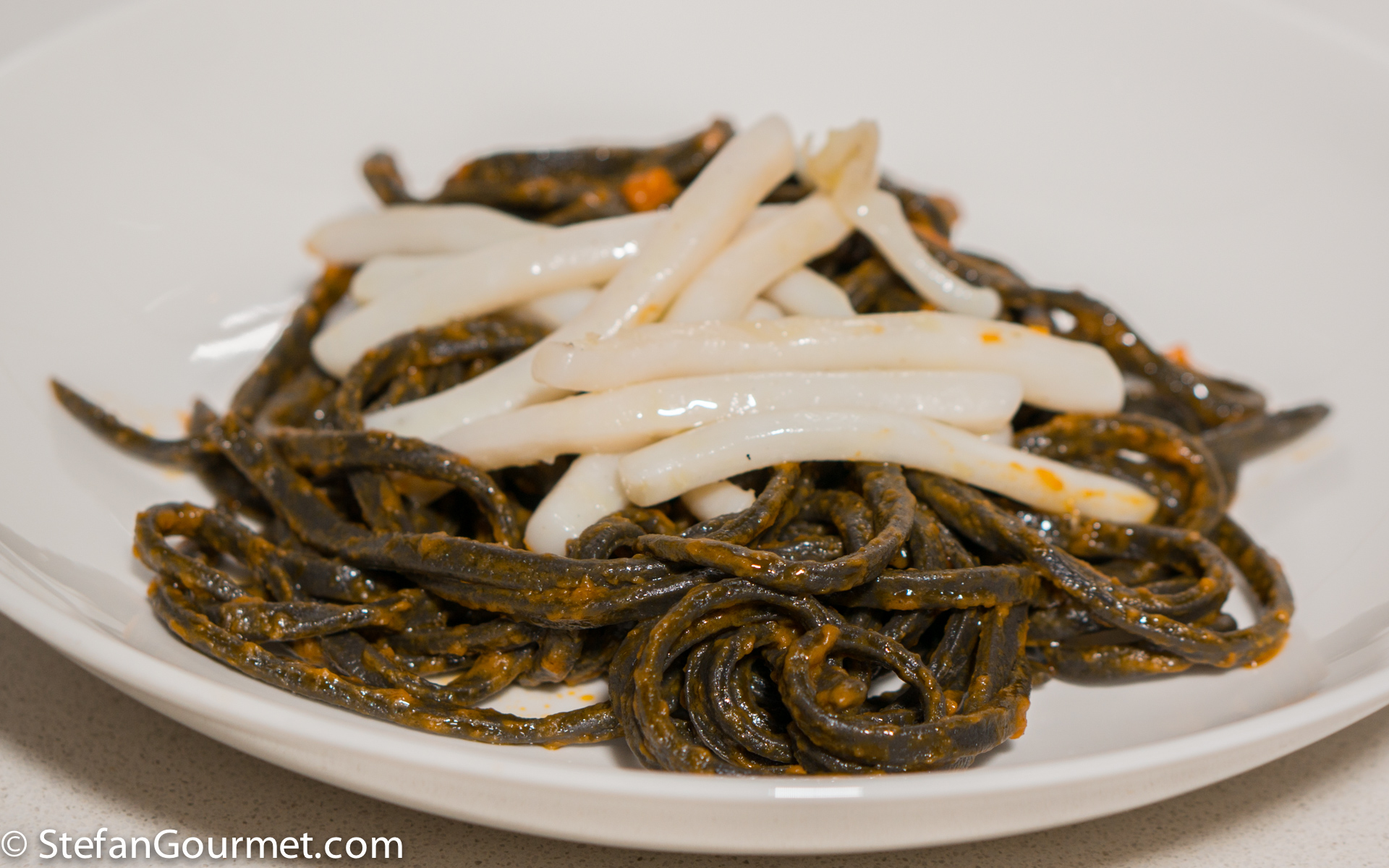 While the pasta is resting, slice the squid into thin strips (thinner than I did on the photo).