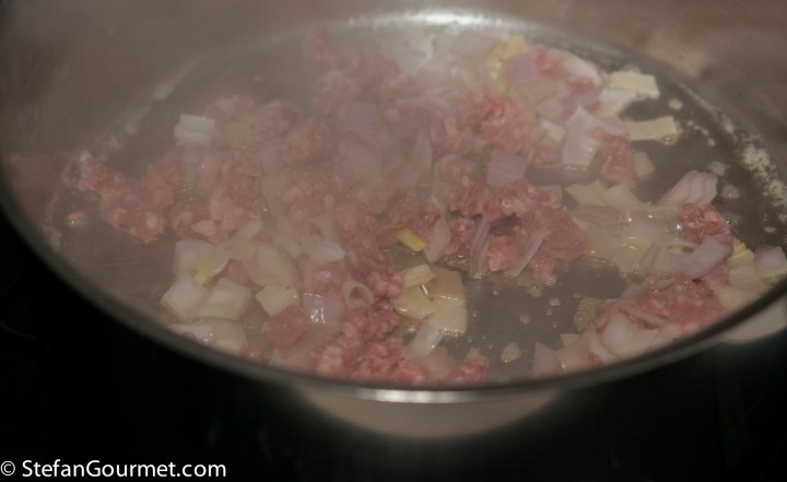 Meanwhile, sauté the sausage and shallot, seasoned with a bit of salt, in a tablespoon of butter…