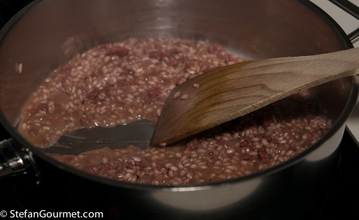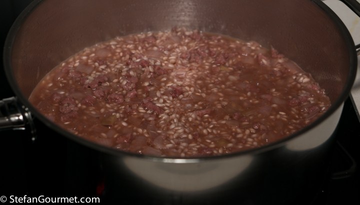 …and stir until it has been absorbed. Then add another ladle of stock, and keep stirring and adding more stock as needed.
