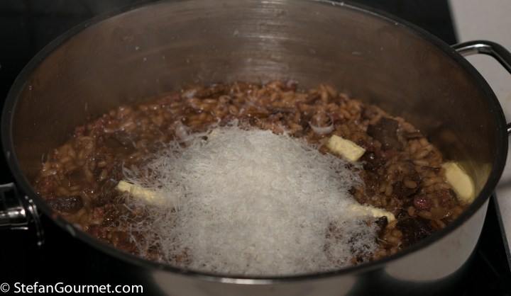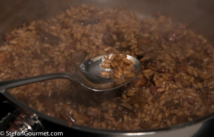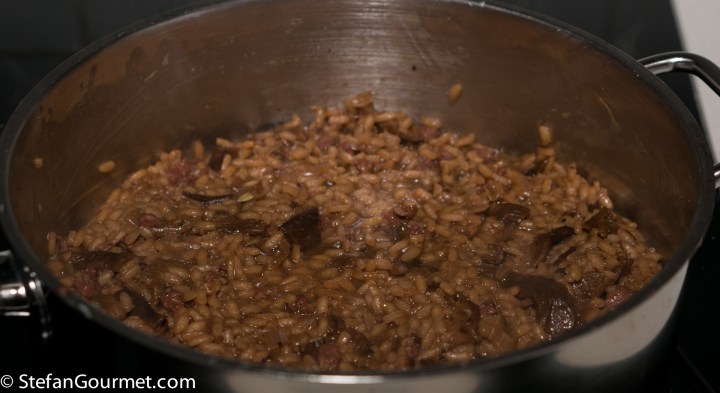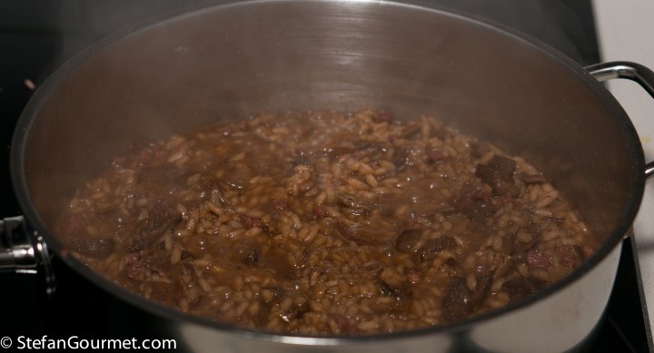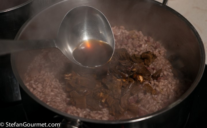 Add the chopped mushrooms to the rice, together with a ladle of mushroom liquid. Keep stirring and adding liquid…