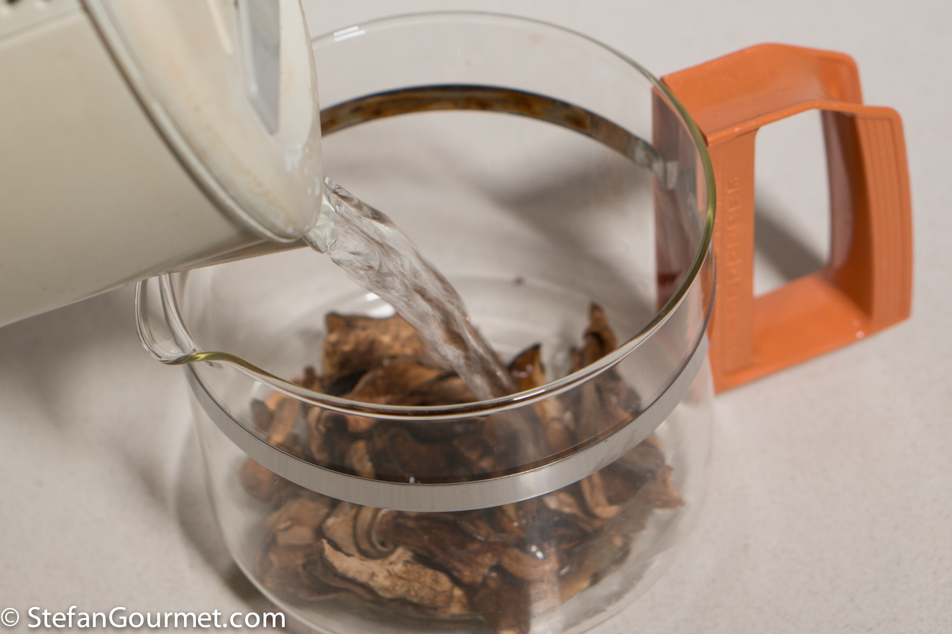 Put the mushrooms in a bowl and cover with boiling water. Allow the mushrooms to soak for at least 10 minutes.