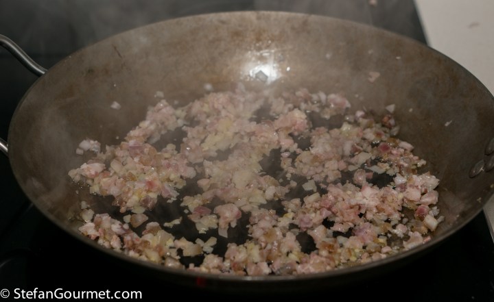 Heat a tablespoon of olive oil in a frying pan and add the pancetta mixture.