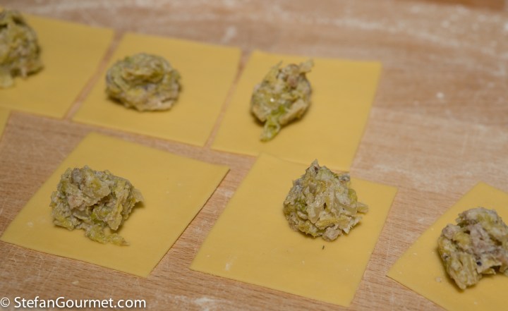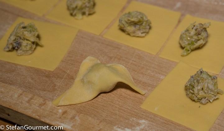 Meanwhile, make the pasta dough, allow it to rest, and roll it out very thinly. Cut it into squares of about 6 cm (2 1/2 inch), and put a teaspoon of filling on the center of each square.
