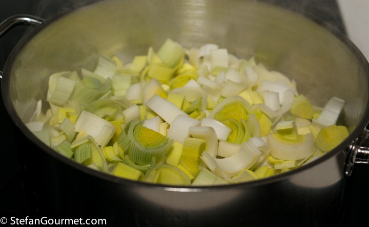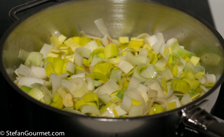 Use only the white and light green part of the leeks. Cut in half lengthwise and then into half rounds. Wash the leeks to make sure to remove all the sand.
