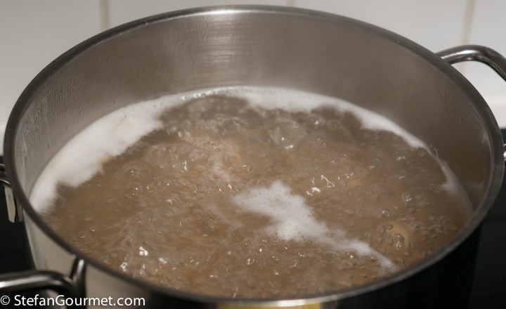 In the meantime, bring a pot of water to a boil. When the water boils, add salt and the pasta. Cook the pasta for the time indicated on the package for al dente, minus 1 or 2 minutes.