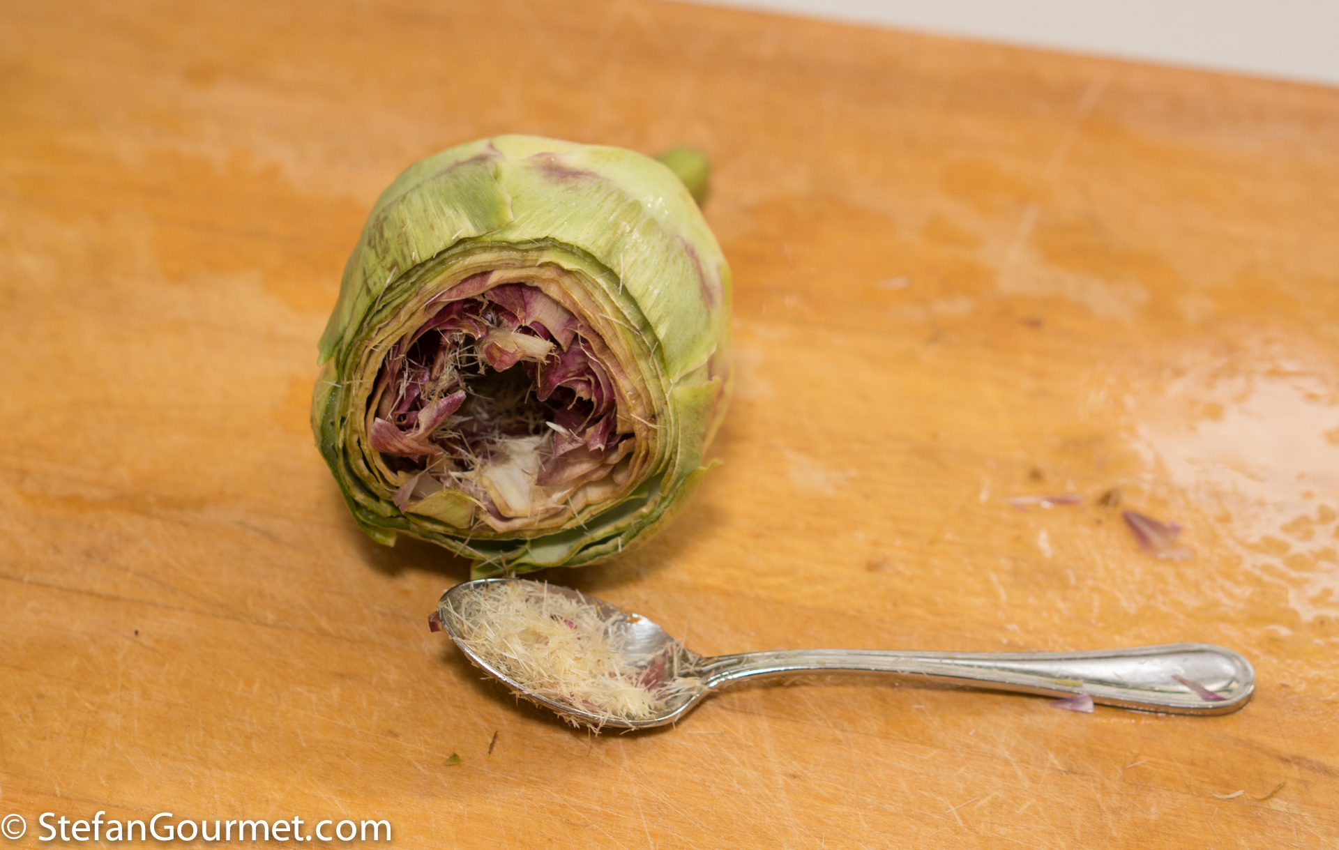 Gently open up the artichoke and remove the ‘hay’ that is inside with a small spoon.