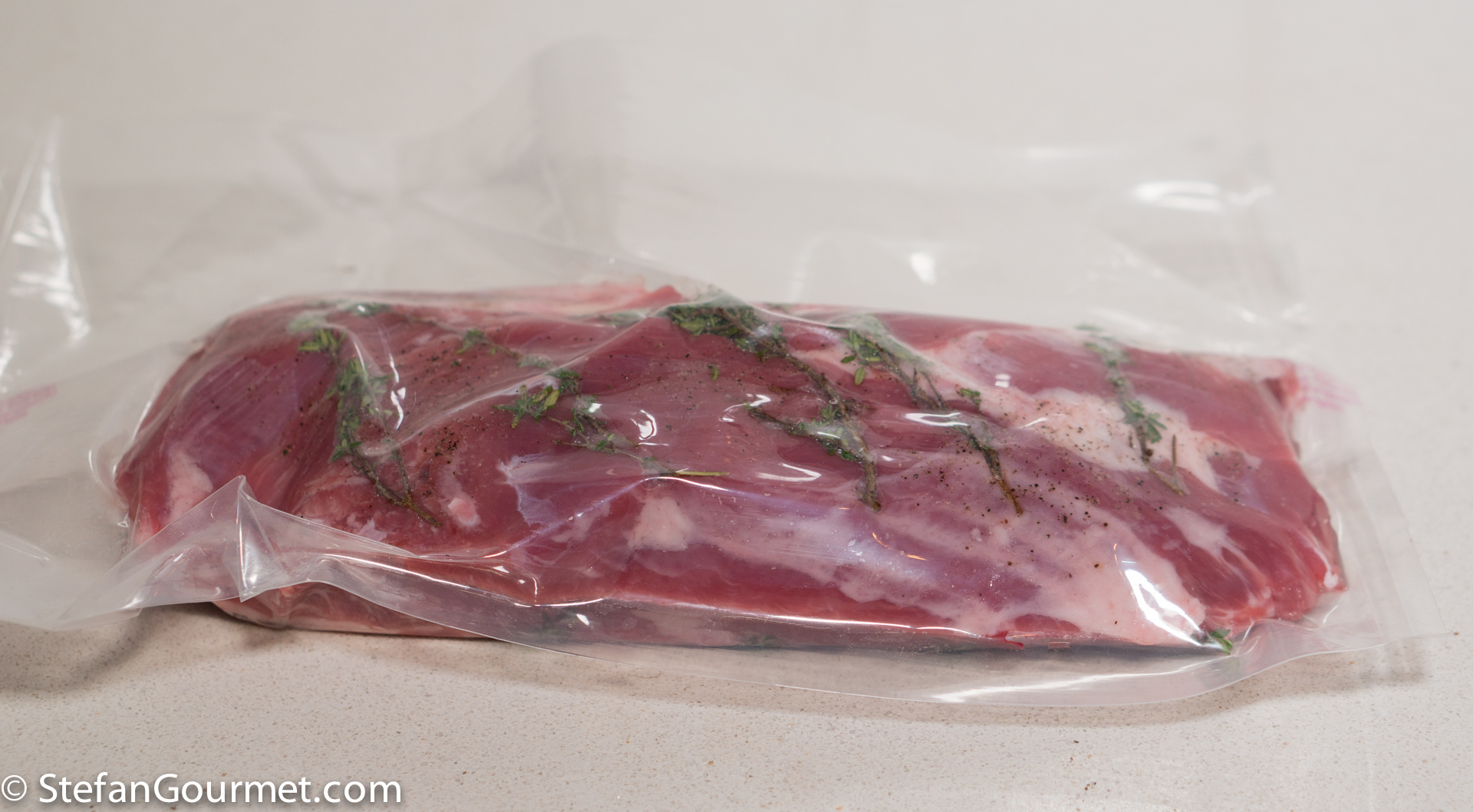 Season the lamb with salt and freshly gound black pepper, and vacuum seal it with some fresh thyme.