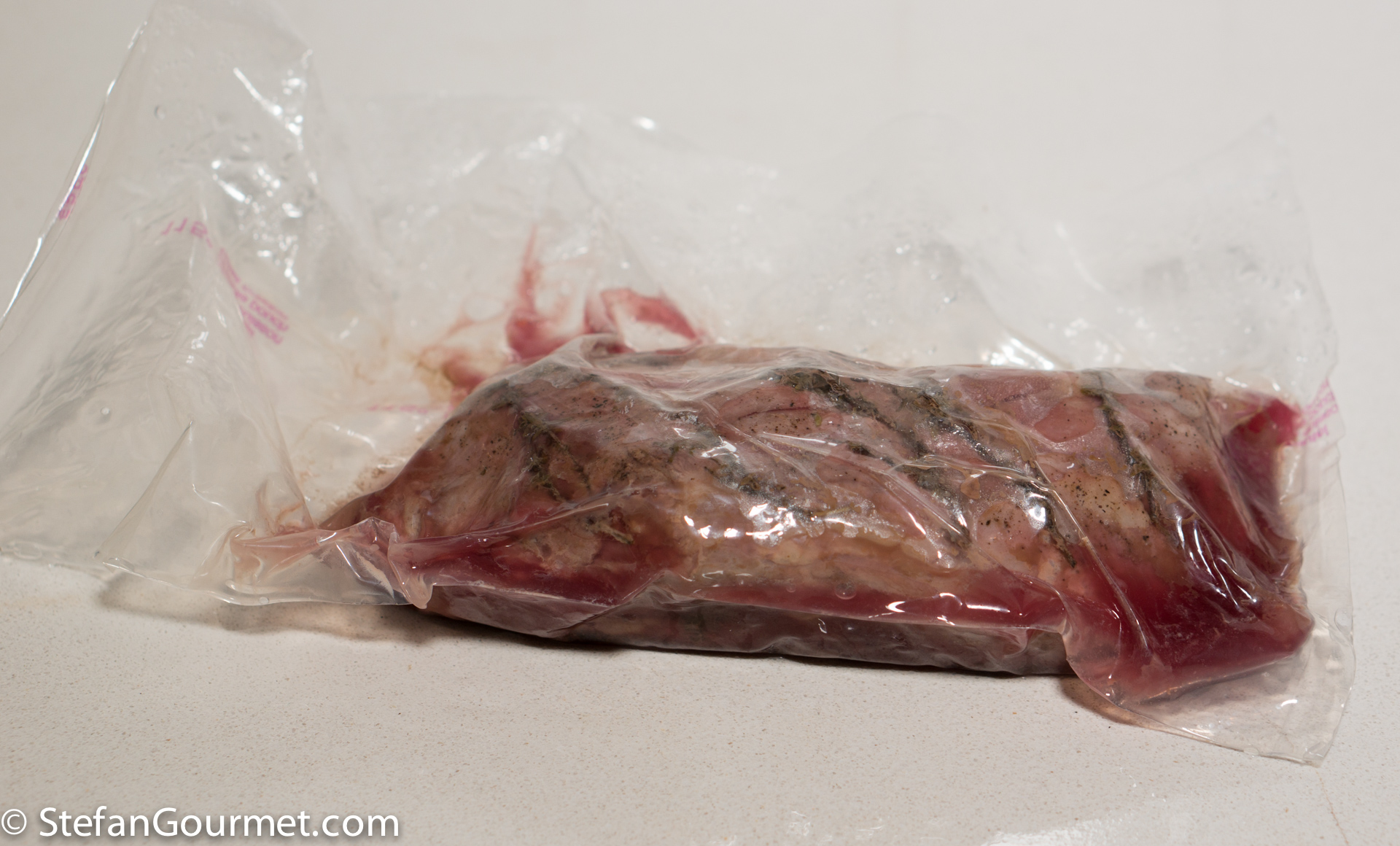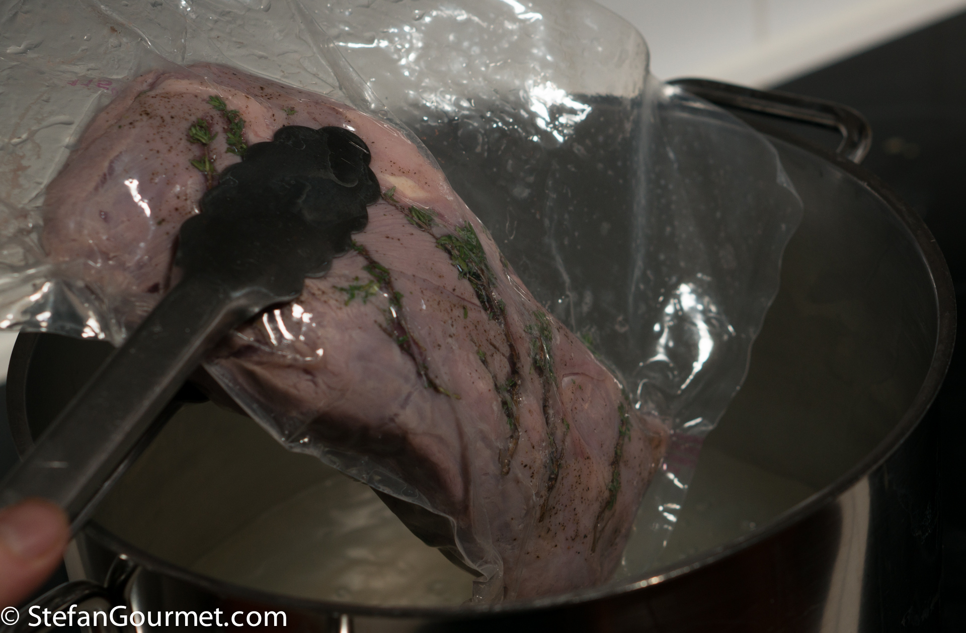 When it is time to serve, take the lamb out of the bag, dry it well with paper towels, and sear quickly over very high heat on all sides in some butter and olive oil.