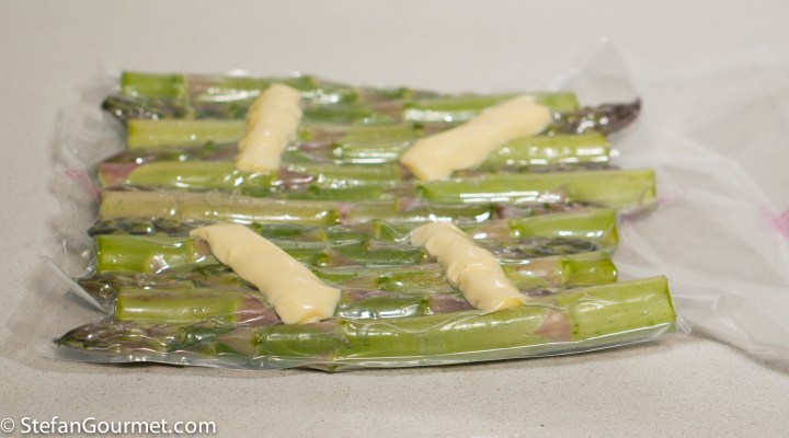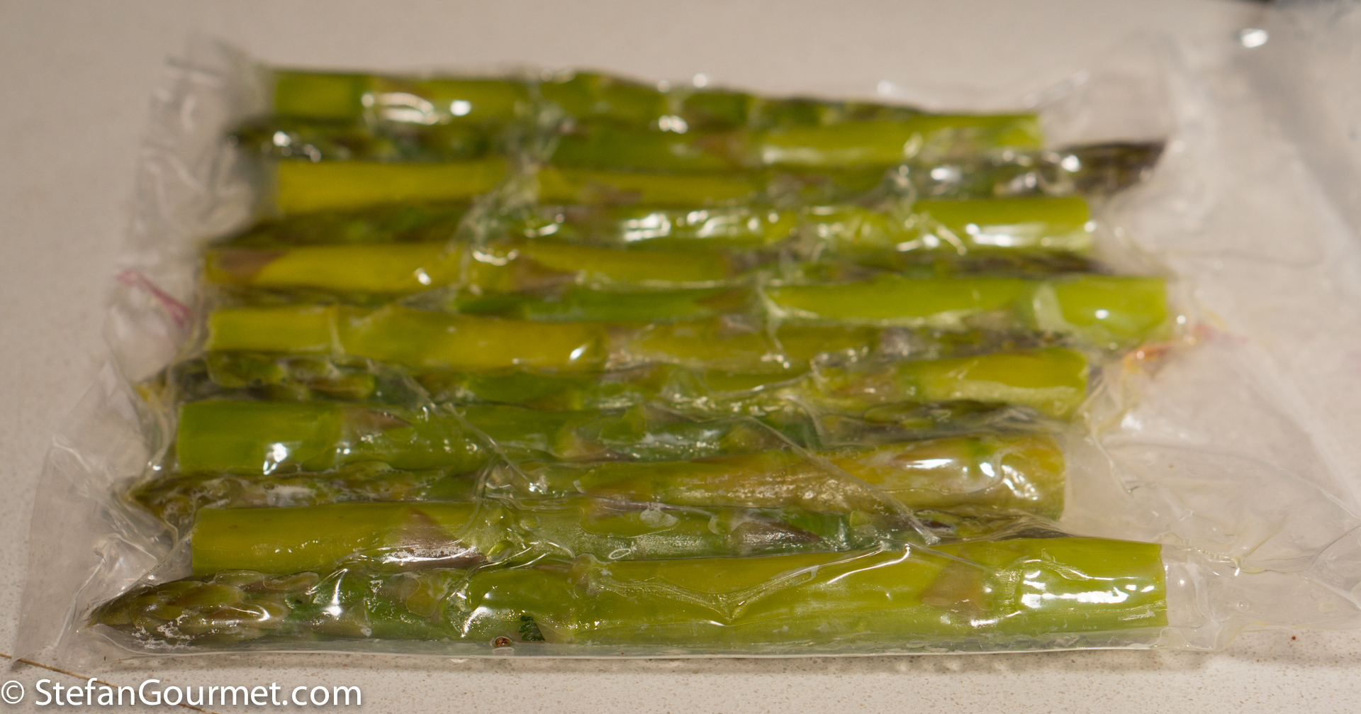 I also cooked the green asparagus sous-vide for 15 minutes at 85C/185F: seasoned with salt and freshly ground black pepper and vacuum sealed with some butter.