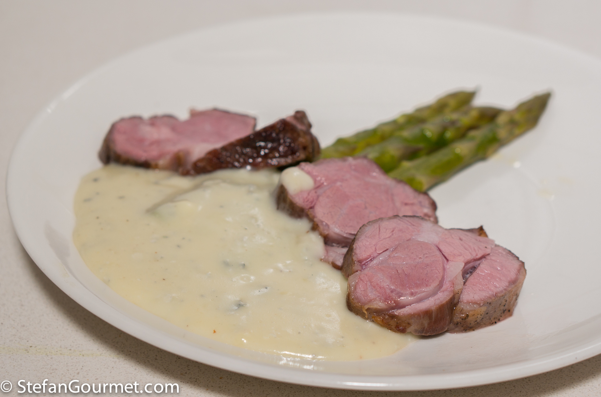 Lamb and asparagus are very seasonal, but what is really the star of this dish is the goat cheese sauce. I used a French artisan raw milk goat cheese, a Selles sur Cher appellation d’origine protegée. I used neck of lamb and cooked both lamb and asparagus sous-vide, but this would also work with another cut of lamb (leg of lamb or rack of lamb) and by cooking the lamb and asparagus in a more conventional way. The sauce looks a bit like a blue cheese sauce because of the ashes on the rind of this cheese, and it is quite pungent. Neck of lamb is one of my favorite cuts because it has so much flavor. If cooked sous-vide for 24 hours at 57C/135F, it will be as tender as leg or rack of lamb, but with more flavor.