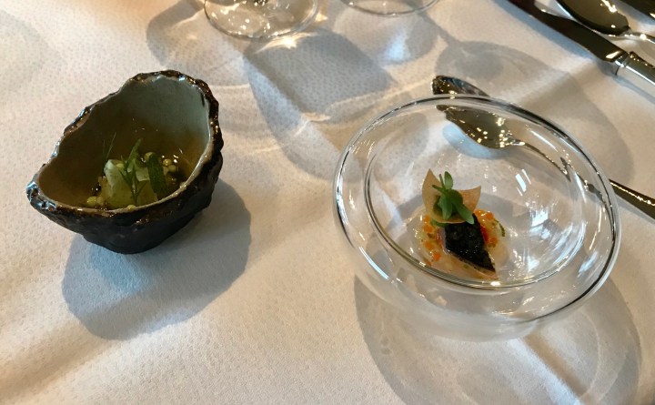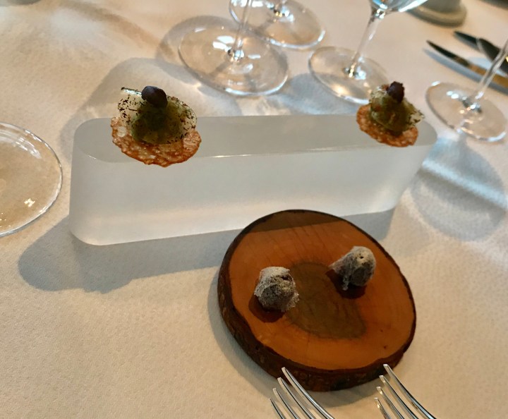 The greetings from the kitchen are accompanied by a glass of rosé champagne. The caramelized kalamata olives have a nice contrast between the salty olive and the crispy sweet coating. The spicy chicken skin with avocado and green olive is a complex and delicious mix of flavors and textures.