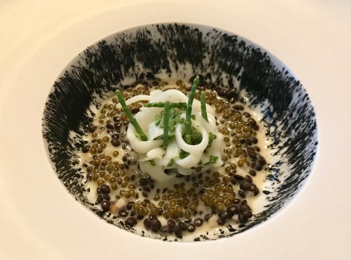 Cuttlefish (squid) cut into the shape of tagliatelle and cooked in a stock of smoked sturgeon with Beluga lentils, imperial caviar, sauce of smoked sturgeon and samphire. The combination of flavors and textures in this dish was just wonderful. The crispy samphire, the creamy sturgeon, the chewy lentils, the tender cuttlefish, it all worked together and was paired with a white wine from Tenerife. The wine is made in an oxidative style from local grape varieties and by itself seemed nothing special, but with the dish it really came to life and was a perfect pairing. 10/10