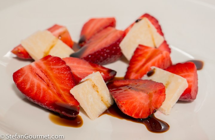 This is hardly a recipe, but it is very good and so I wanted to share it with you anyway. In Italy this is called a “salad” of strawberries and parmigiano. To make this work, you will need high quality ingredients: