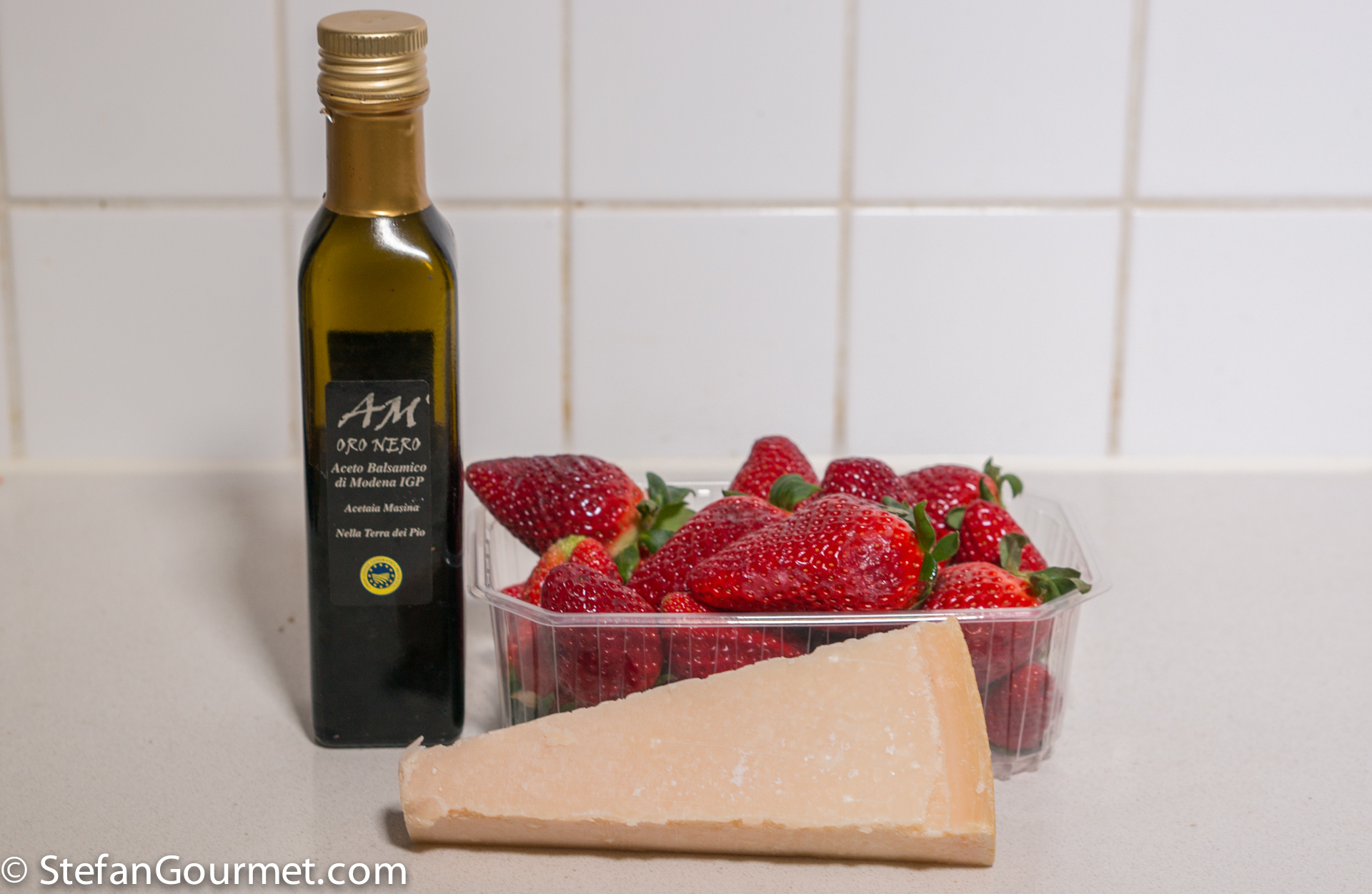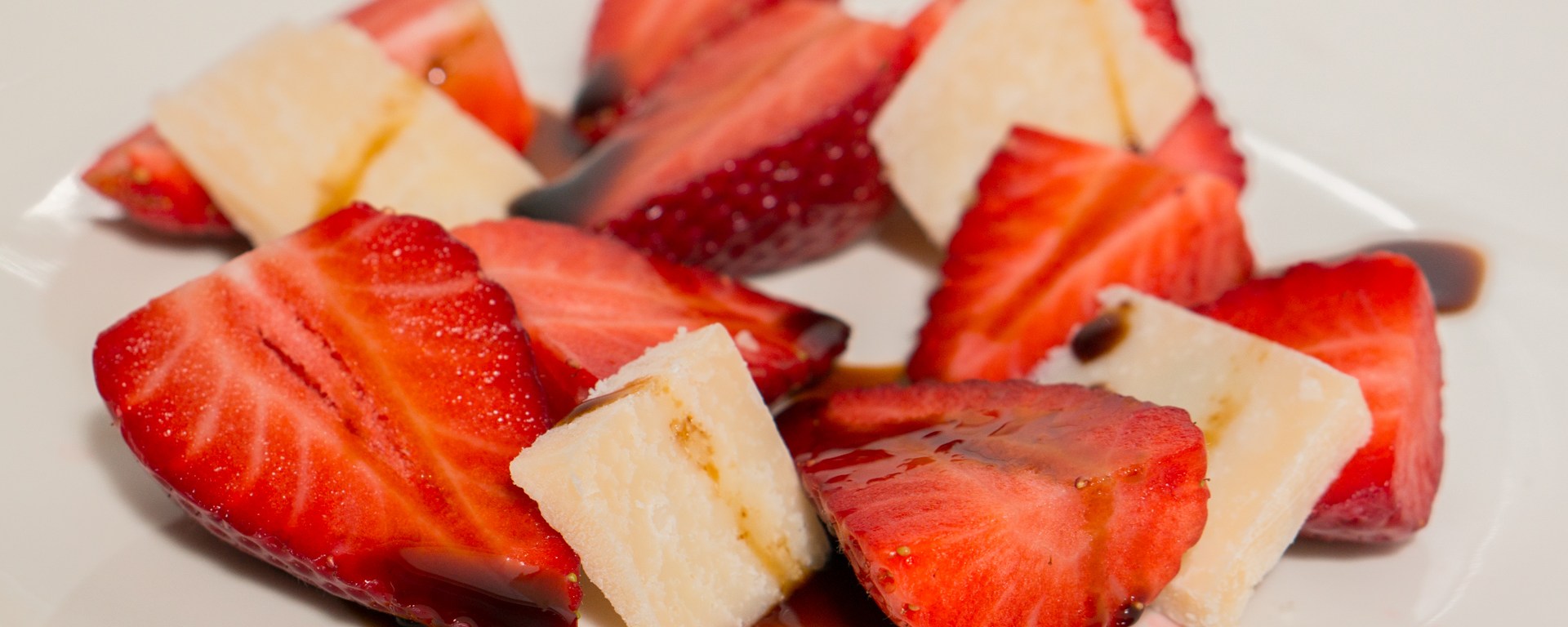 This is hardly a recipe, but it is very good and so I wanted to share it with you anyway. In Italy this is called a “salad” of strawberries and parmigiano. To make this work, you will need high quality ingredients: