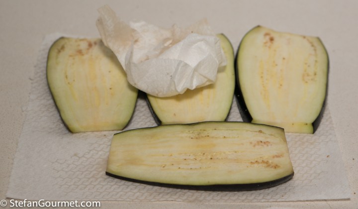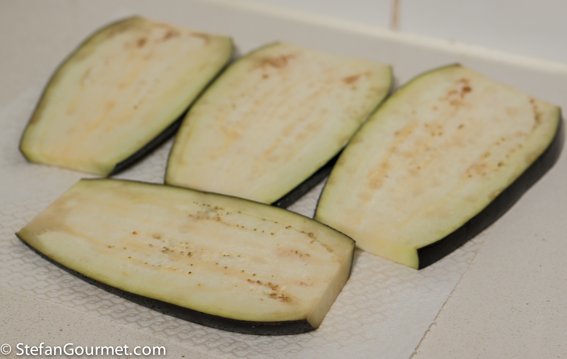 Cut both ends off the eggplant and discard. Make 4 nice slices lengthwise, as explained in this post. Lightly sprinkle all slices with salt on both sides, and allow the salt to draw out the juices for an hour or so.
