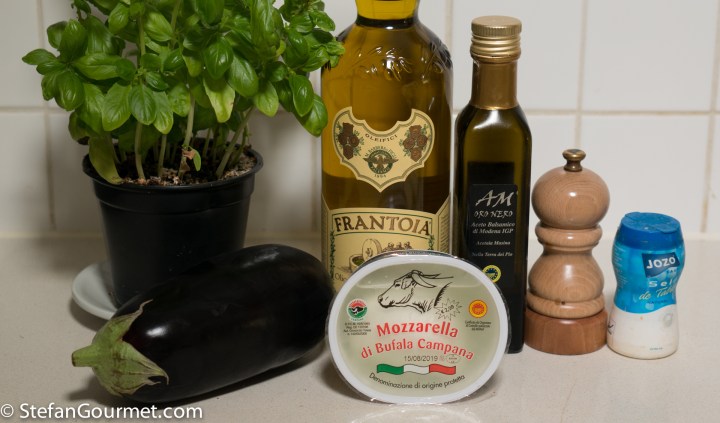 Cut the buffalo mozzarella into 4 pieces, and season them with salt. Season the eggplant with freshly ground black pepper. Drizzle each eggplant slice with extra virgin olive oil and a bit of balsamic. Put a basil leaf on the eggplant, then the mozzarella, then another basil leaf.