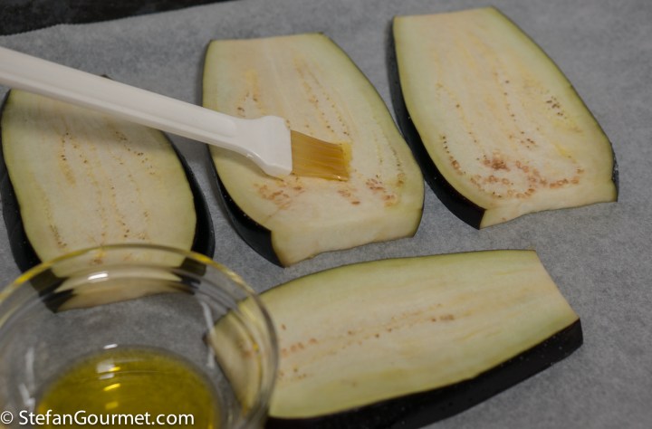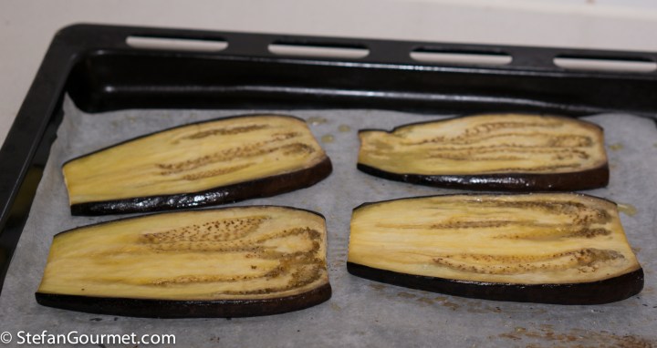 Bake the eggplant at 180C/350F for about 20 minutes on an oven sheet lined with oven paper, turning them halfway.
