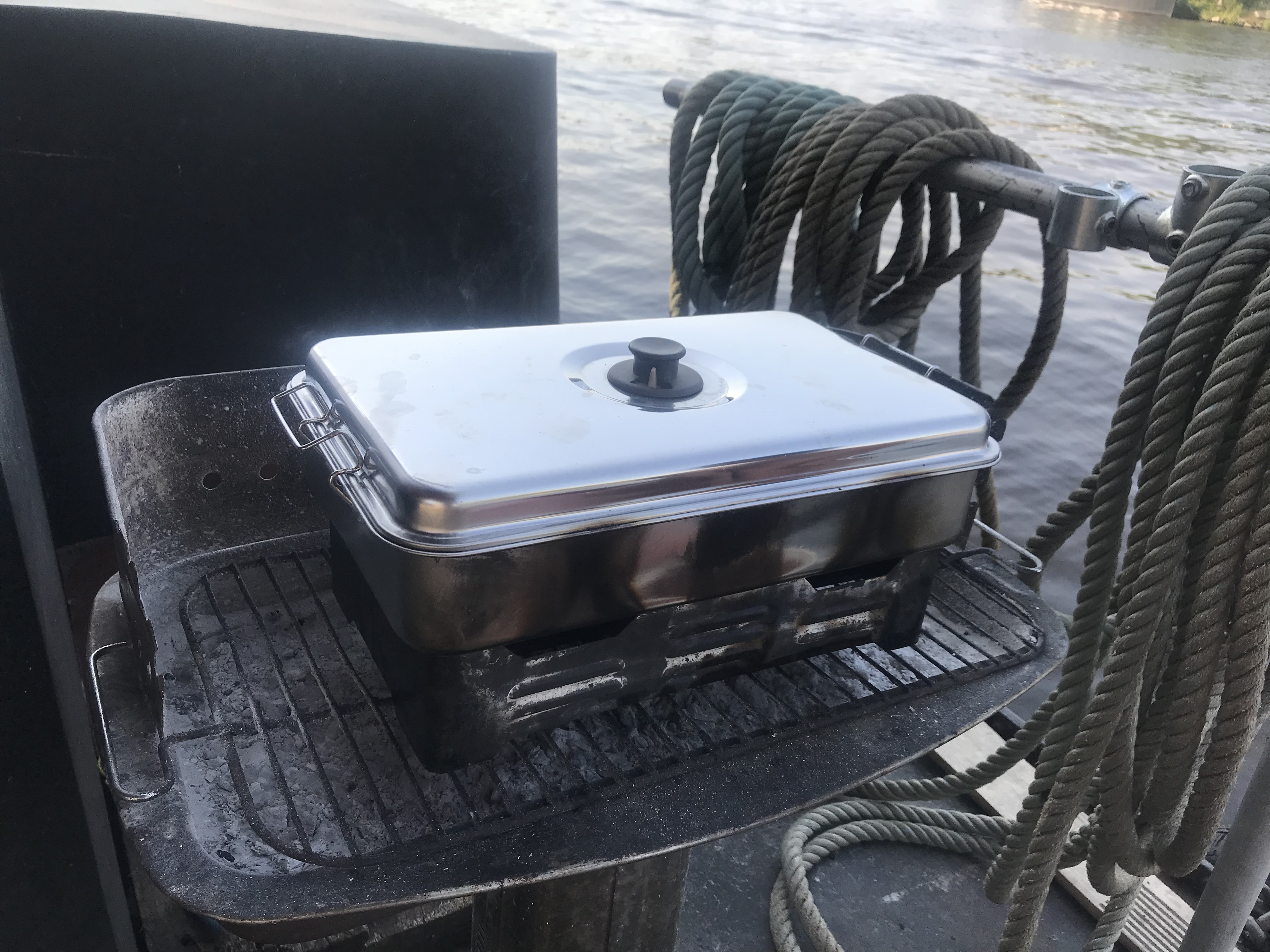 Motorized barge on the river. Tabletop smokers are indeed great for fish. Mackerel, salmon, trout. Or barramundi 😎