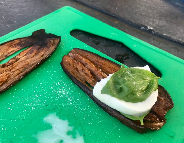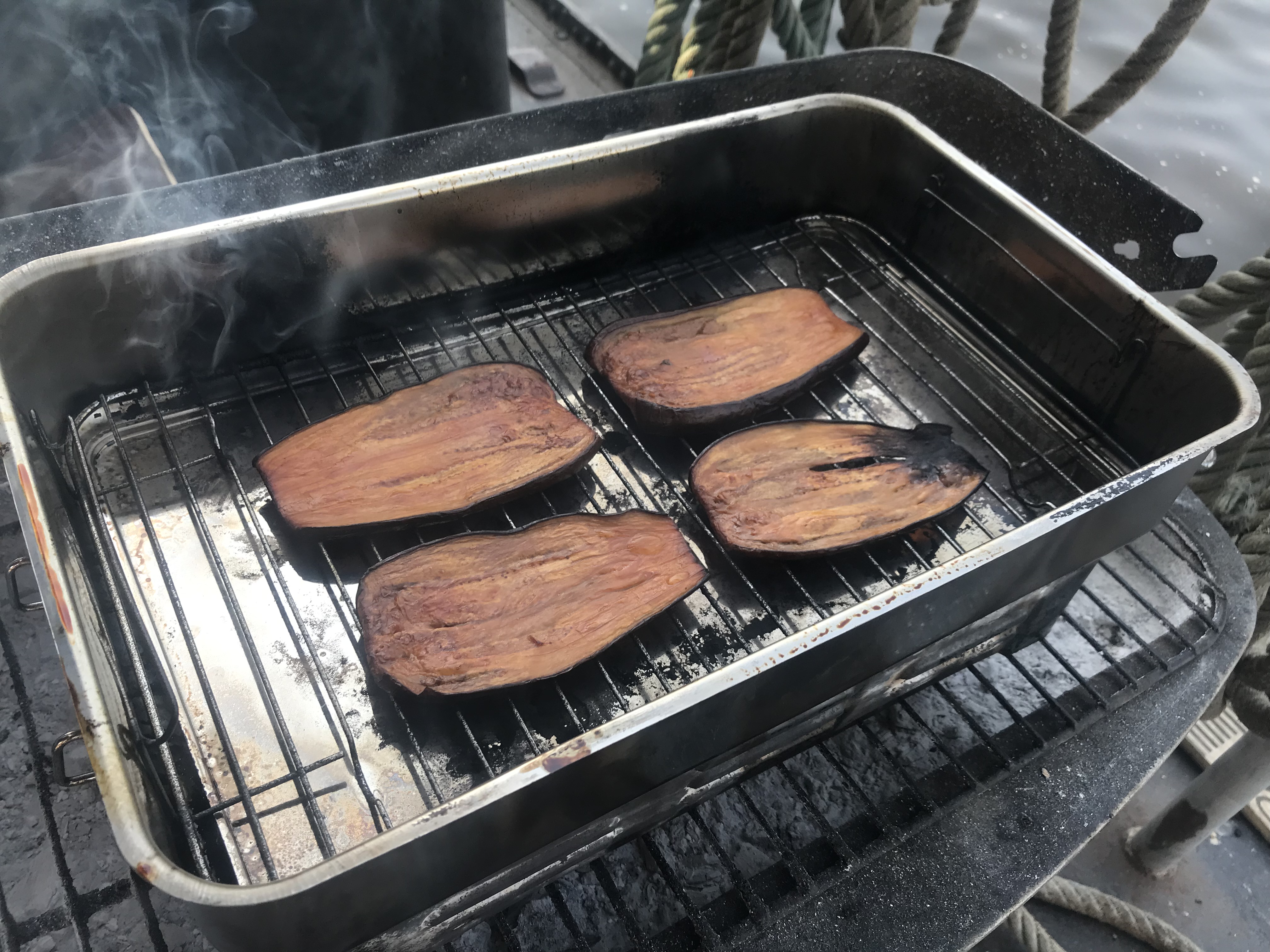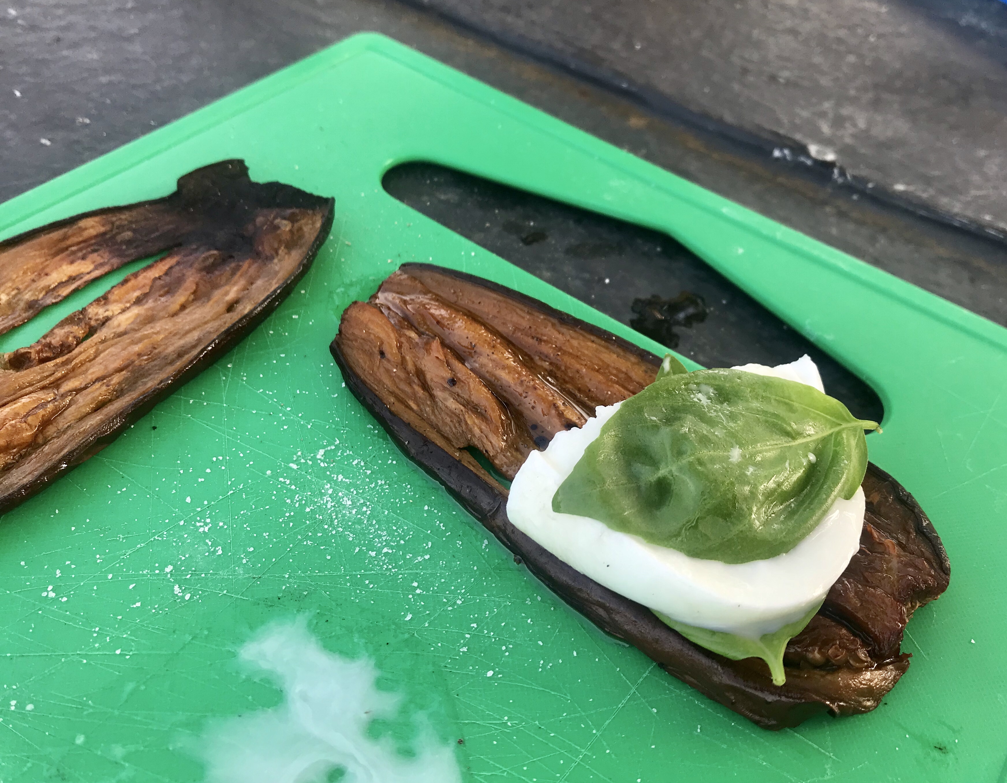 This is not the first recipe I’ve posted for eggplant and mozzarella, and it probably won’t be the last because they work really well together. What makes this version special is that the eggplant is smoked. I served this as an antipasto on the boat, which is why half of the photos were taken with my phone.