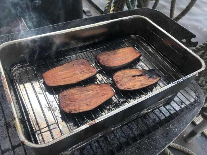 Great ! Every eggplant recipe welcome ! Have meant to buy a table top smoker for ages to prepare fish Nordic style . . . can’t wait to try ! Sail- or motorboat ? On the river ? The water looks perfectly calm ., . .