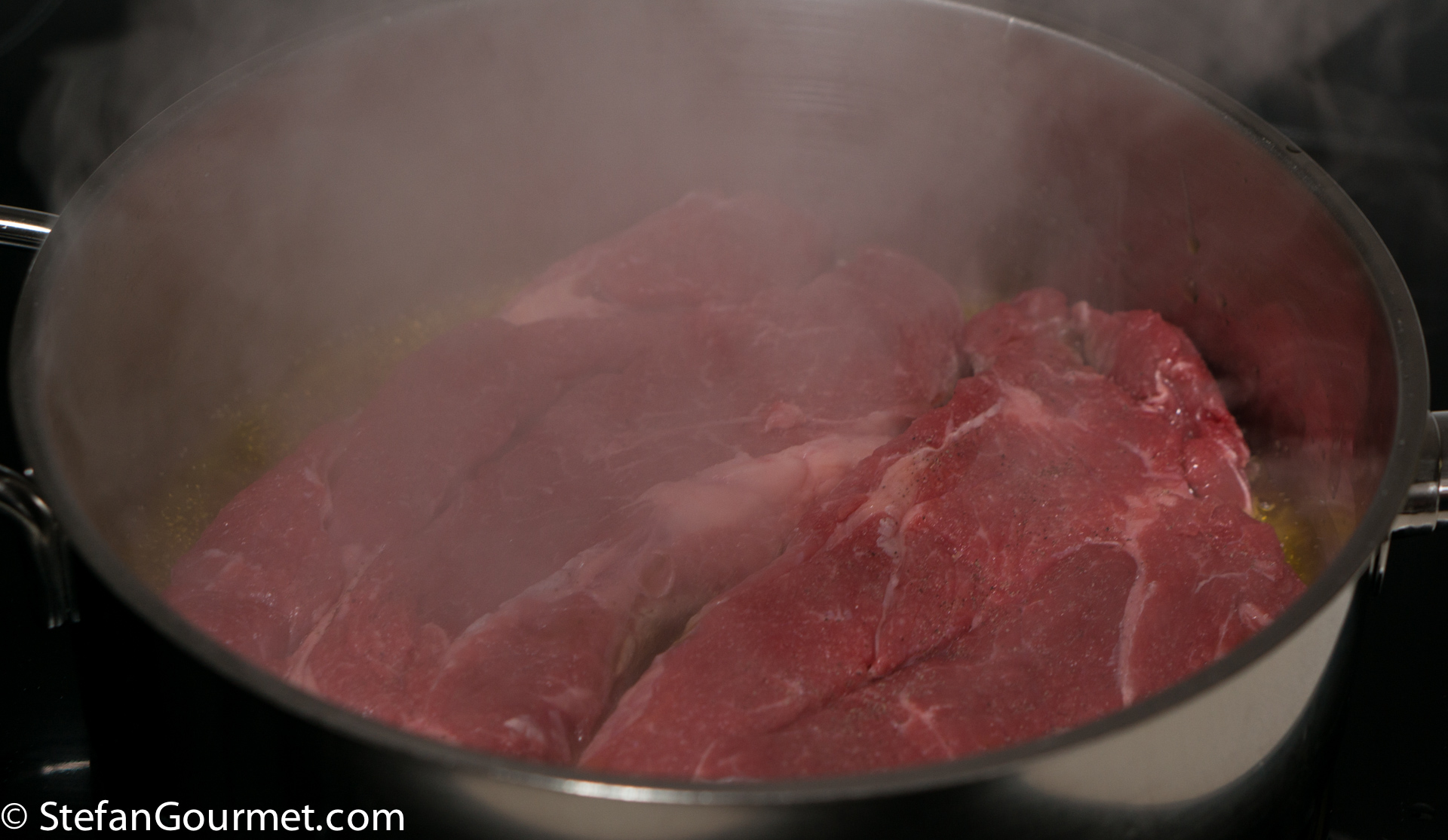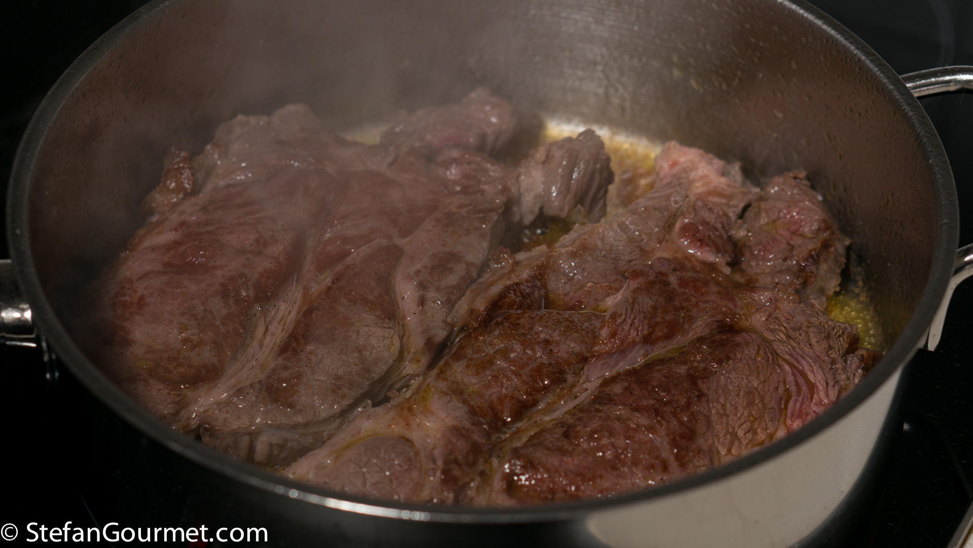 Season the beef with salt on all sides. Heat oil in a frying pan, add the beef…