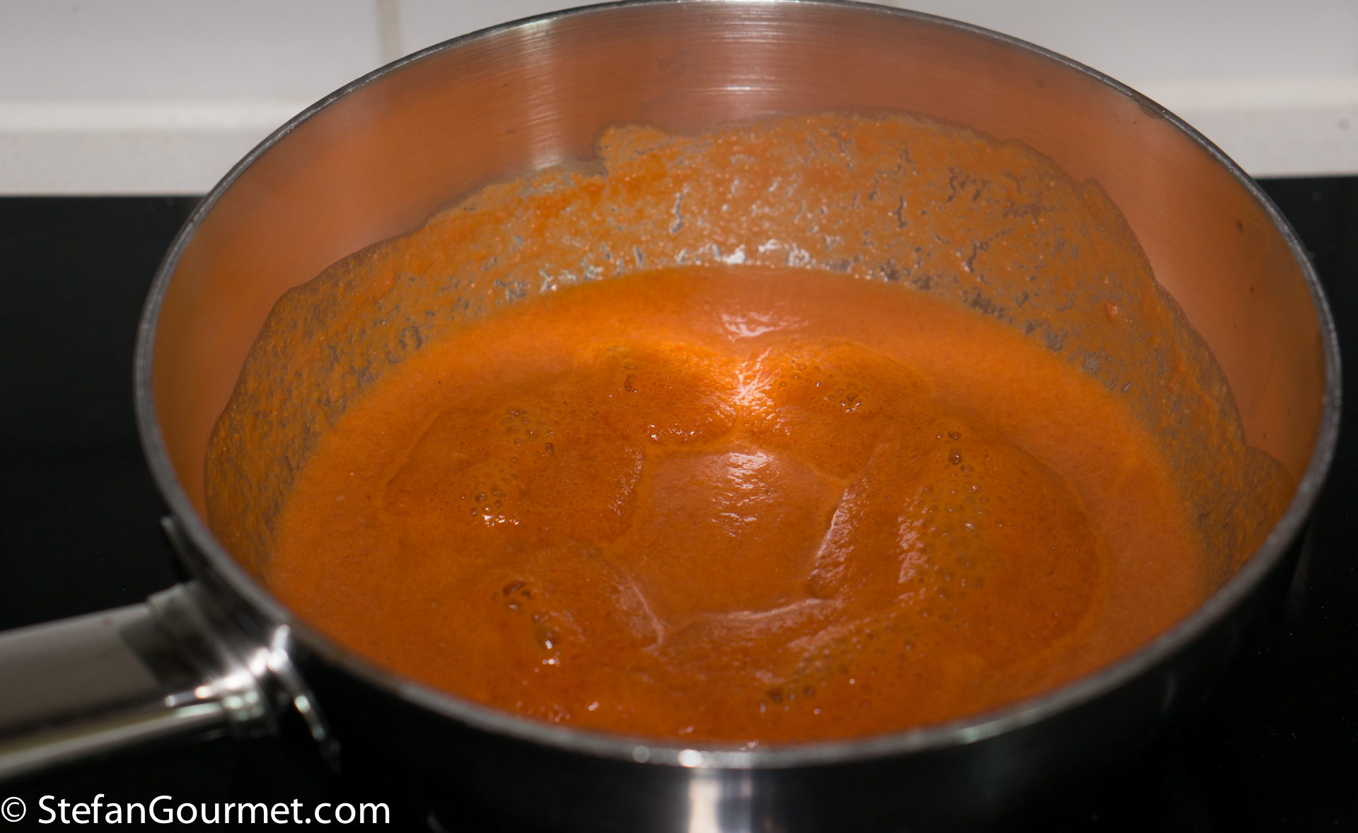 Once the beef has been cooked sous-vide, put the juices from the bag in a blender together with the tomato.