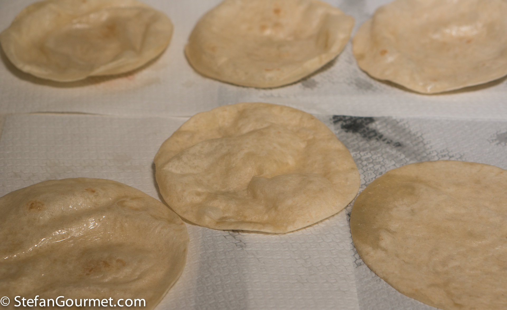 Allow the tortillas to drain on paper towels, and pat with paper towels to get rid of any excess oil.