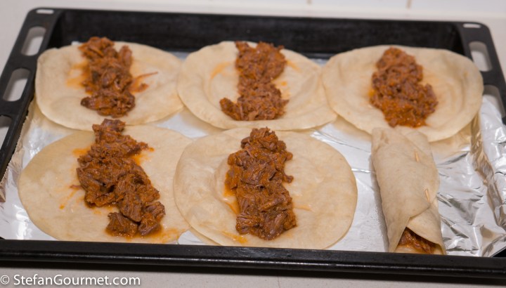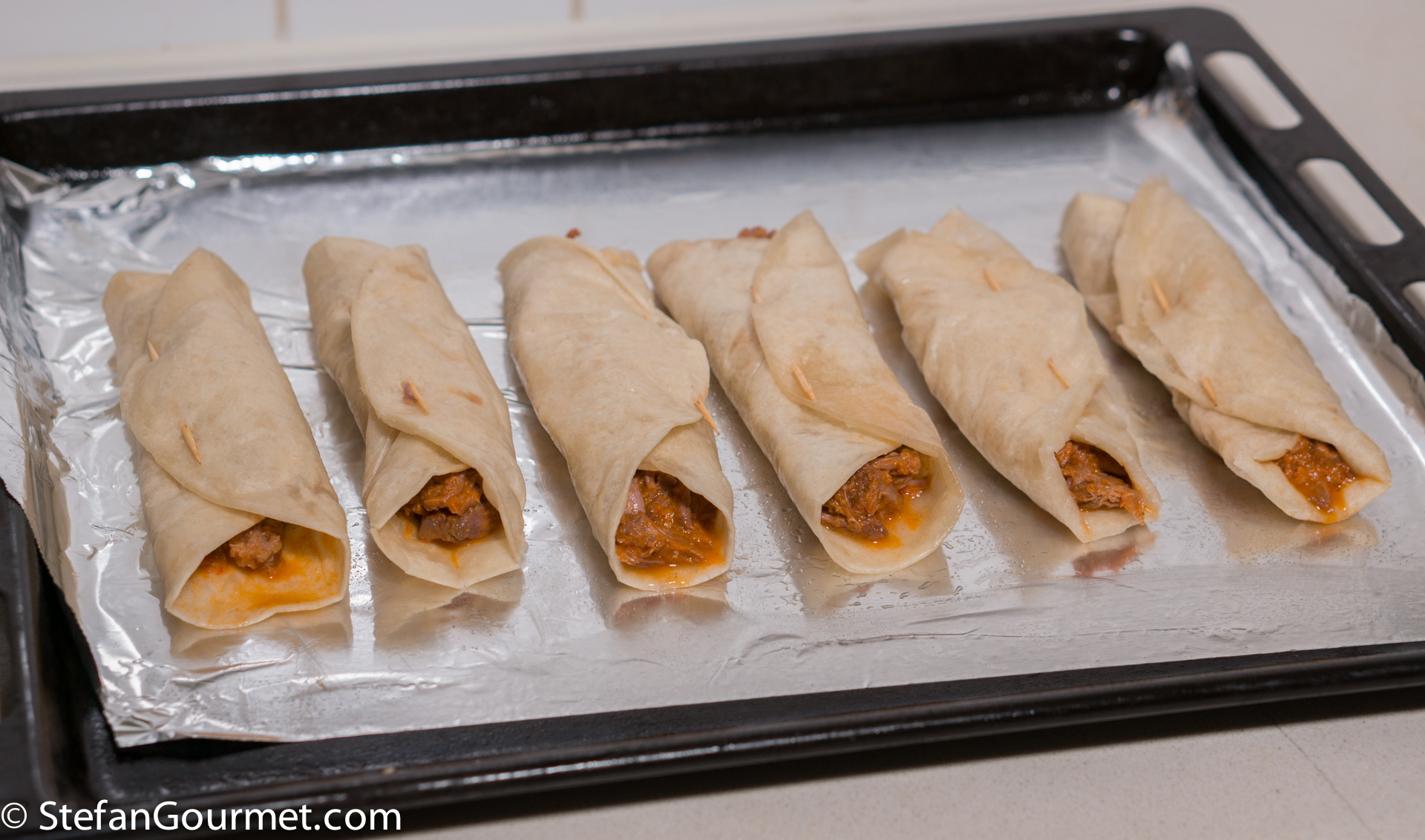 Line a baking sheet with aluminum foil or oven paper. Arrange the tortillas on the baking sheet and place 1/6 of the meat filling on each tortilla. Then roll them up, and secure with a tooth pick as shown.