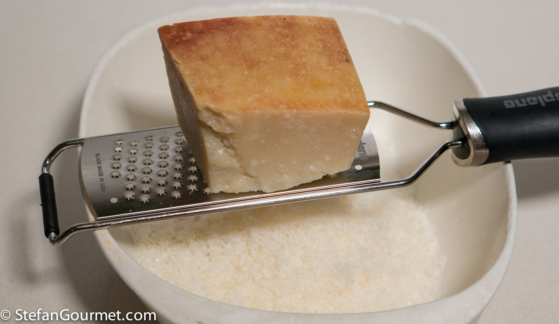 Grate the parmigiano. Always use real parmigiano reggiano and always grate it freshly. The flavor is so much better than fake parmesan or already grated.