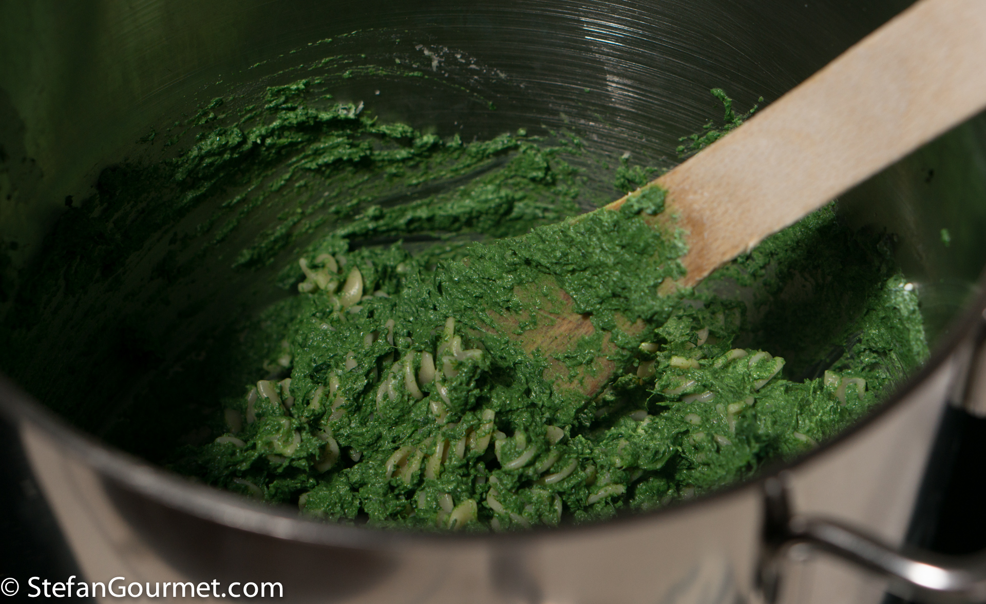 Stir over low heat until the fusilli has ‘absorbed’ the spinach.