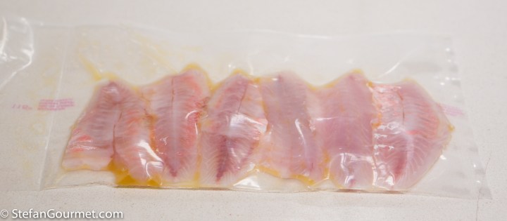 Cook the red mullet sous-vide for about half an hour at 46C/115F.
