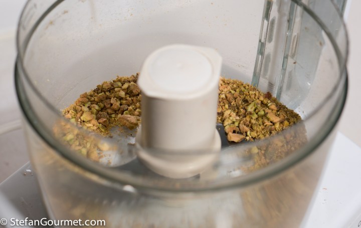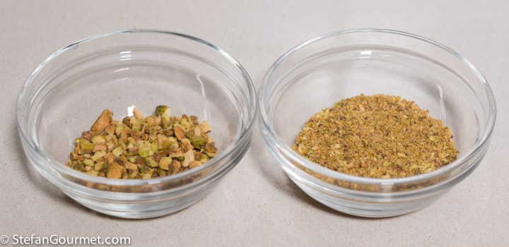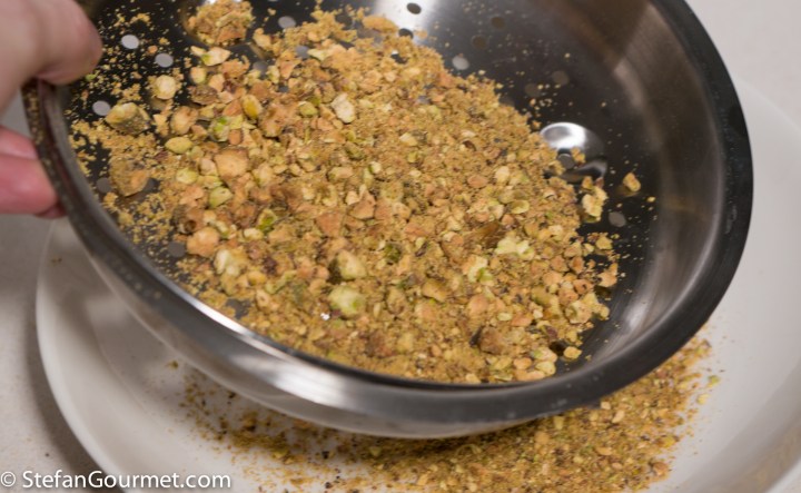 …to separate into ground pistachios and chopped pistachios. You should end up with about 2 tablespoons of each.