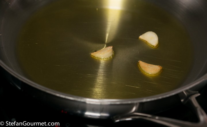 Bring a large pot of water to a boil for the pasta. Meanwhile, heat 2 tablespoons of olive oil in a frying pan. Peel the garlic clove and slice it thickly. Tilt the pan and cook the garlic in the oil over medium heat until golden, then discard the garlic. Using this technique, you infuse the oil with garlic flavor.