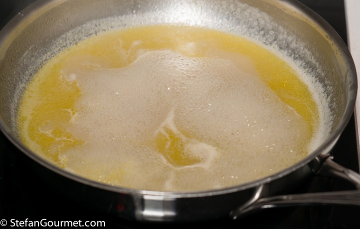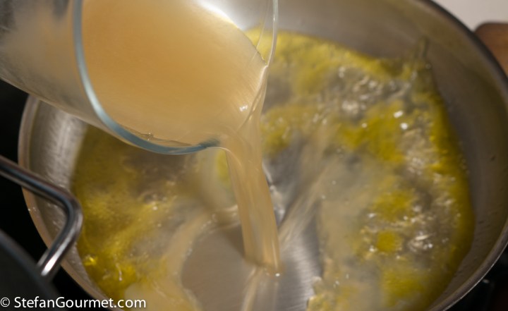 …and 250 ml of fish stock. Allow to reduce by about half over medium heat.