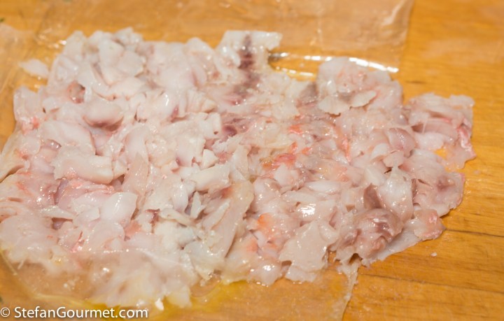 Red mullet is a very tasty fish, but it dries out easily as it is very lean. By cooking it sous-vide at a low temperature, the fish will be very tender and juicy. Flaked and mixed with extra virgin olive oil, it is even better. Because red mullet has so much flavor, it can be paired with pistachios. For this pasta dish I used fresh pasta and a sauce of extra virgin olive oil, fish stock, white wine, ground pistachios, grated lemon zest, and parsley. The dish is finished with the flaked mullet and chopped pistachios. If you don’t want to make fresh pasta, you can get store-bought fresh pasta or even use dry pasta. This dish was wonderful and I will be making it again. Here’s what I did…