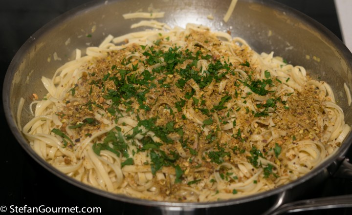 What a simple but promising dish as I do not remember having prepared a fish and pistachio pasta before. Love it being different but so simple and elegant at the same time. Well, at this busy time of the year store-bought fresh pasta may have to suffice and you know my methods of cooking fish . . . but with well-made fish stock at home I am certain me and mine will enjoy the meal . . .