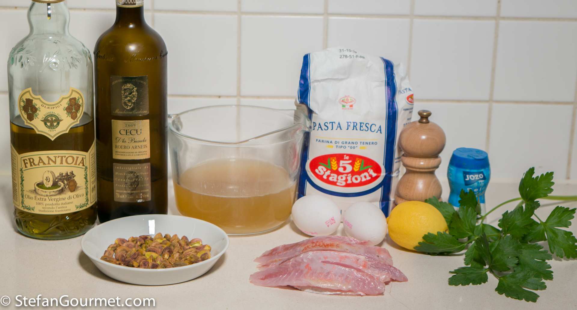 Red mullet is a very tasty fish, but it dries out easily as it is very lean. By cooking it sous-vide at a low temperature, the fish will be very tender and juicy. Flaked and mixed with extra virgin olive oil, it is even better. Because red mullet has so much flavor, it can be paired with pistachios. For this pasta dish I used fresh pasta and a sauce of extra virgin olive oil, fish stock, white wine, ground pistachios, grated lemon zest, and parsley. The dish is finished with the flaked mullet and chopped pistachios. If you don’t want to make fresh pasta, you can get store-bought fresh pasta or even use dry pasta. This dish was wonderful and I will be making it again. Here’s what I did…