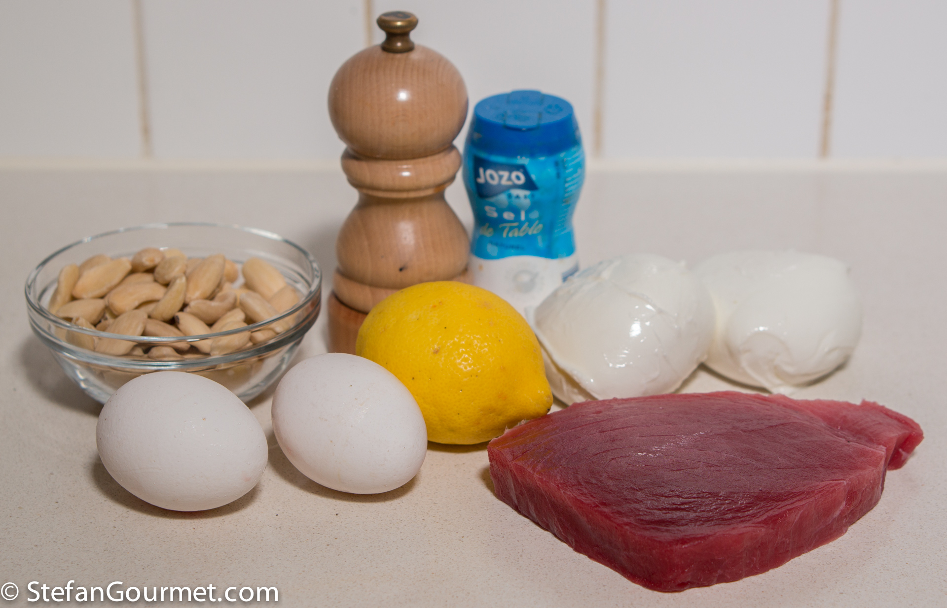 Prepare more or less round shapes with mozzarella mostly on the outside and tuna mostly on the inside, as we would like to melt the mozzarella without really cooking the tuna. You could also make an incision in the mozzarella and insert the tuna into that.