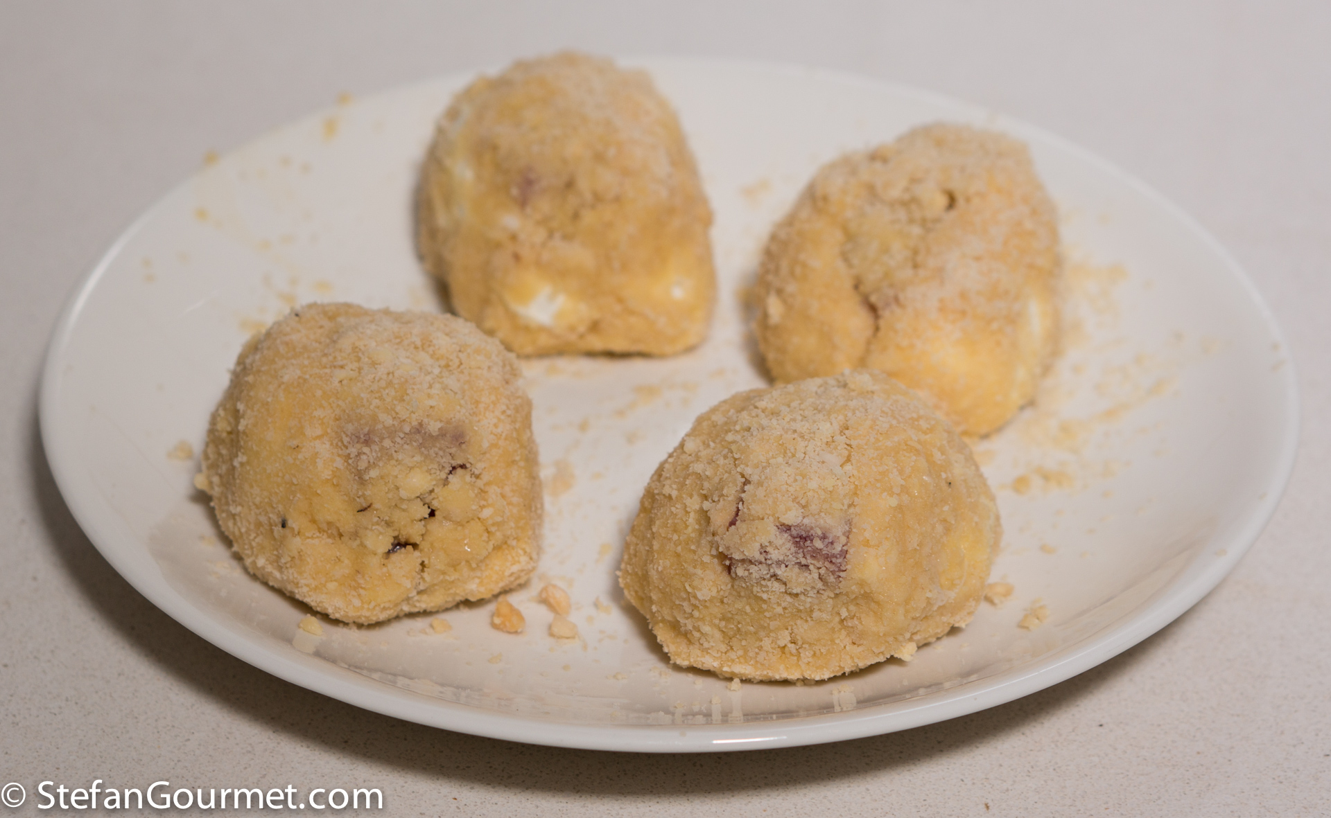 Take a mozzarella/tuna ‘ball’ and dust it with flour. Then dip it in the beaten egg and make sure it is coated on all sides.
