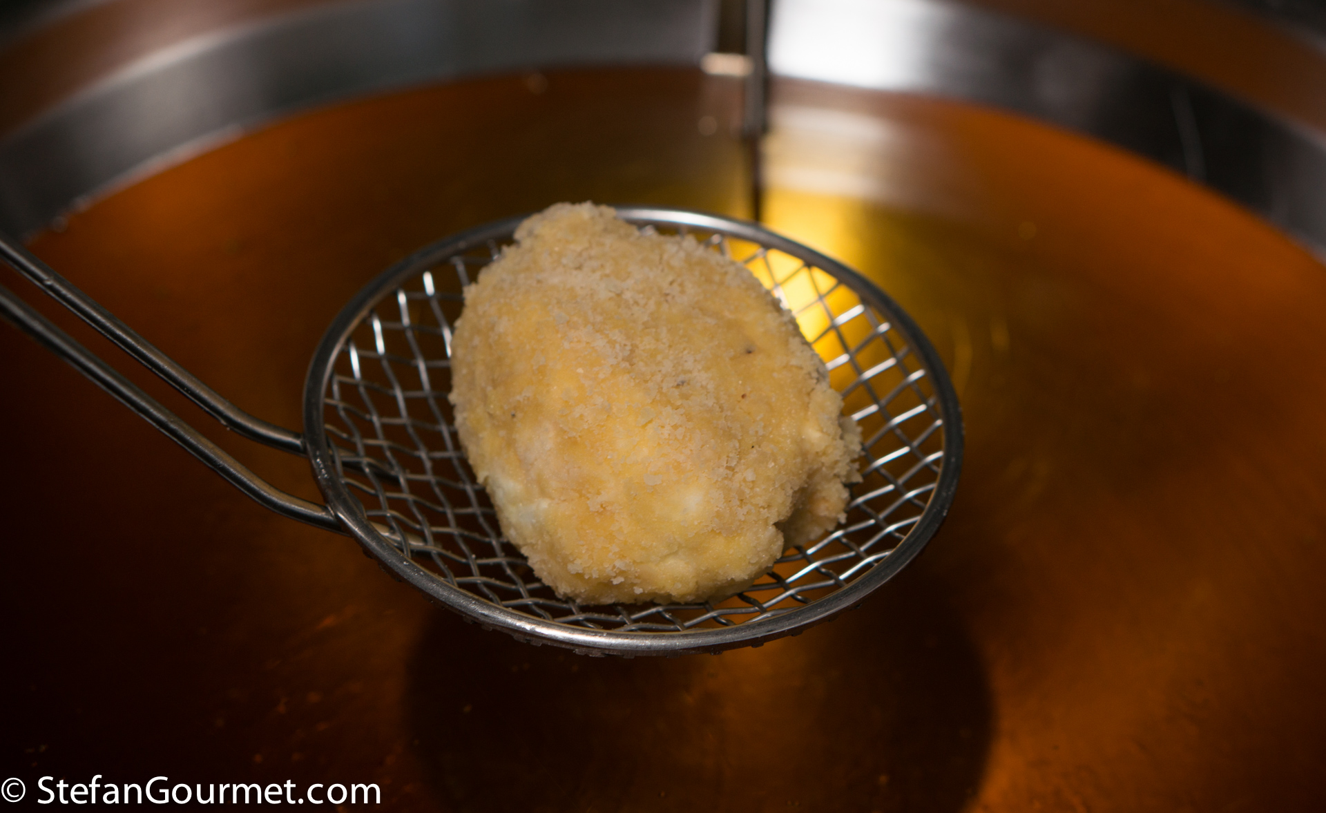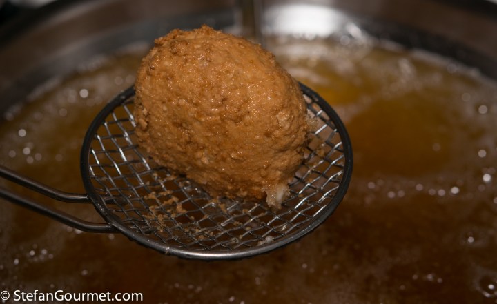 Heat a generous amount of oil (at least 2 litres/2 quarts) to 180C/350F. When the oil is hot, carefully lower the mozzarella and tuna balls into the hot oil.