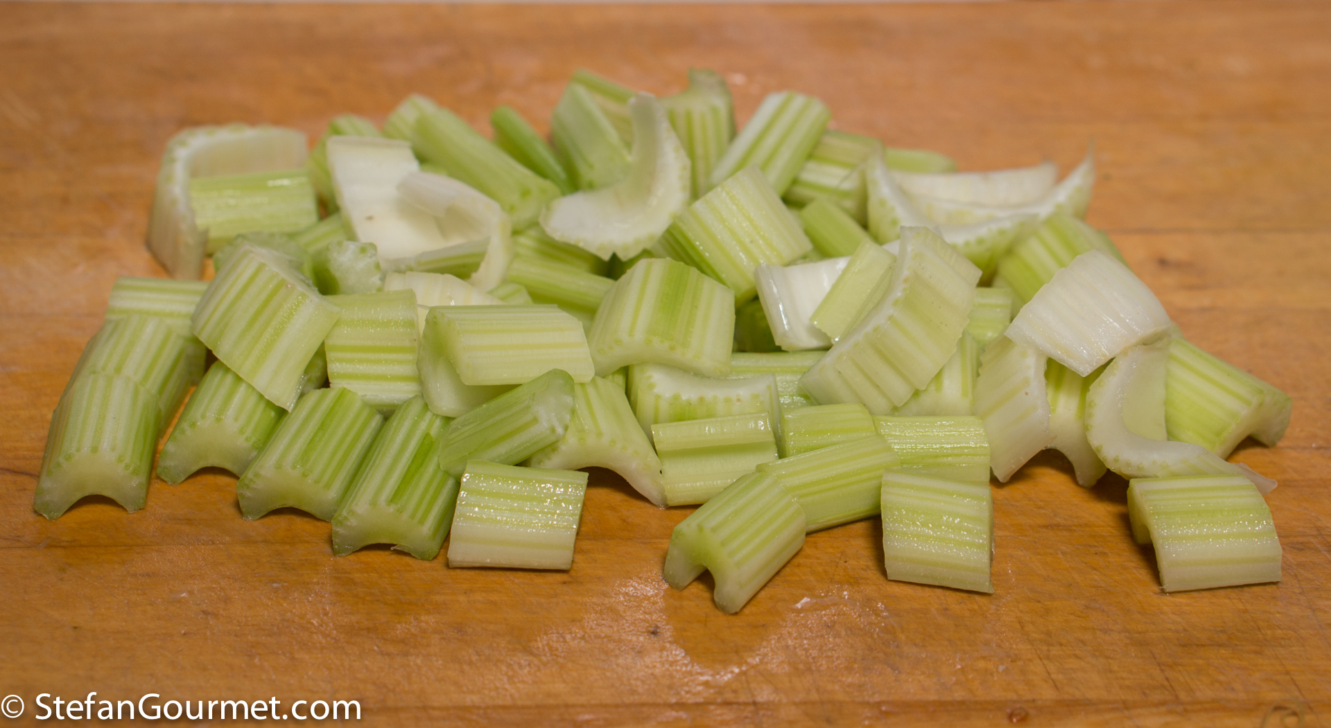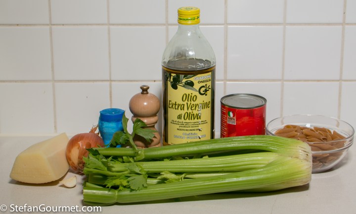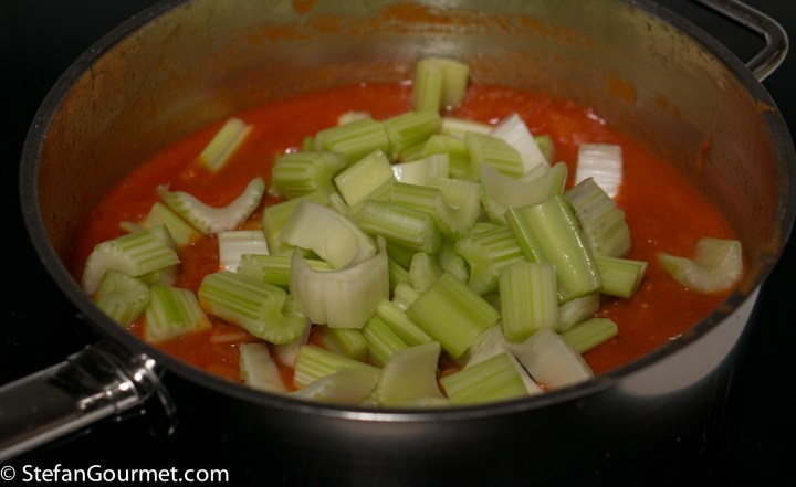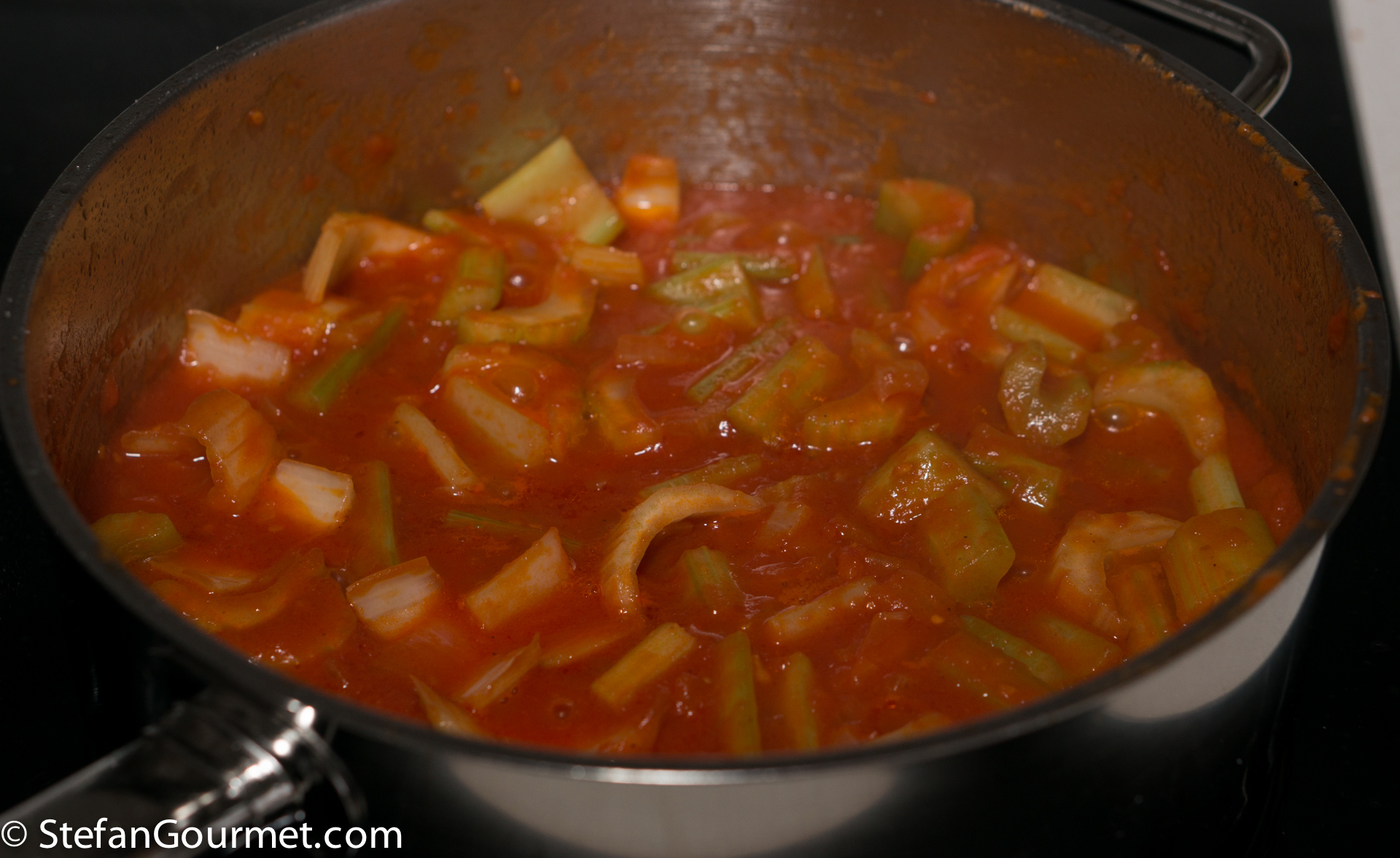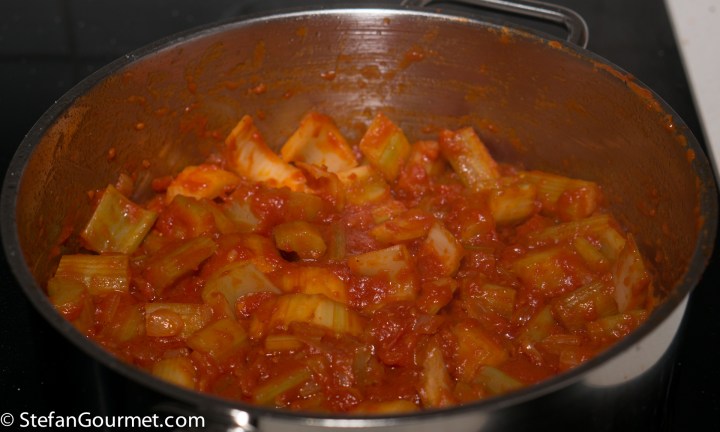 I prepared this dish a couple of months ago and neglected to blog about it. Although Stefano presented it as a summer dish, it is great for autumn as well. Celery is often used in Italian cooking together with onions and carrots, but in this dish it shines on its own. Celery is braised in a tomato sauce, and then served as a side dish on its own, or over pasta. I did the latter. Kees usually likes all the food I cook, but in this case (as I could have expected, because I know he hates celery) he refused to eat it. But if you like celery, this is really nice. The celery needs to be braised until it is tender, which can take quite a while. The reason for that is that the acidity of the tomatoes actually keeps the celery firm. For a shorter cooking time, you could first blanch the celery in water with a bit of baking soda. Baking soda is alkaline and has the opposite effect of acid on cooking the celery.