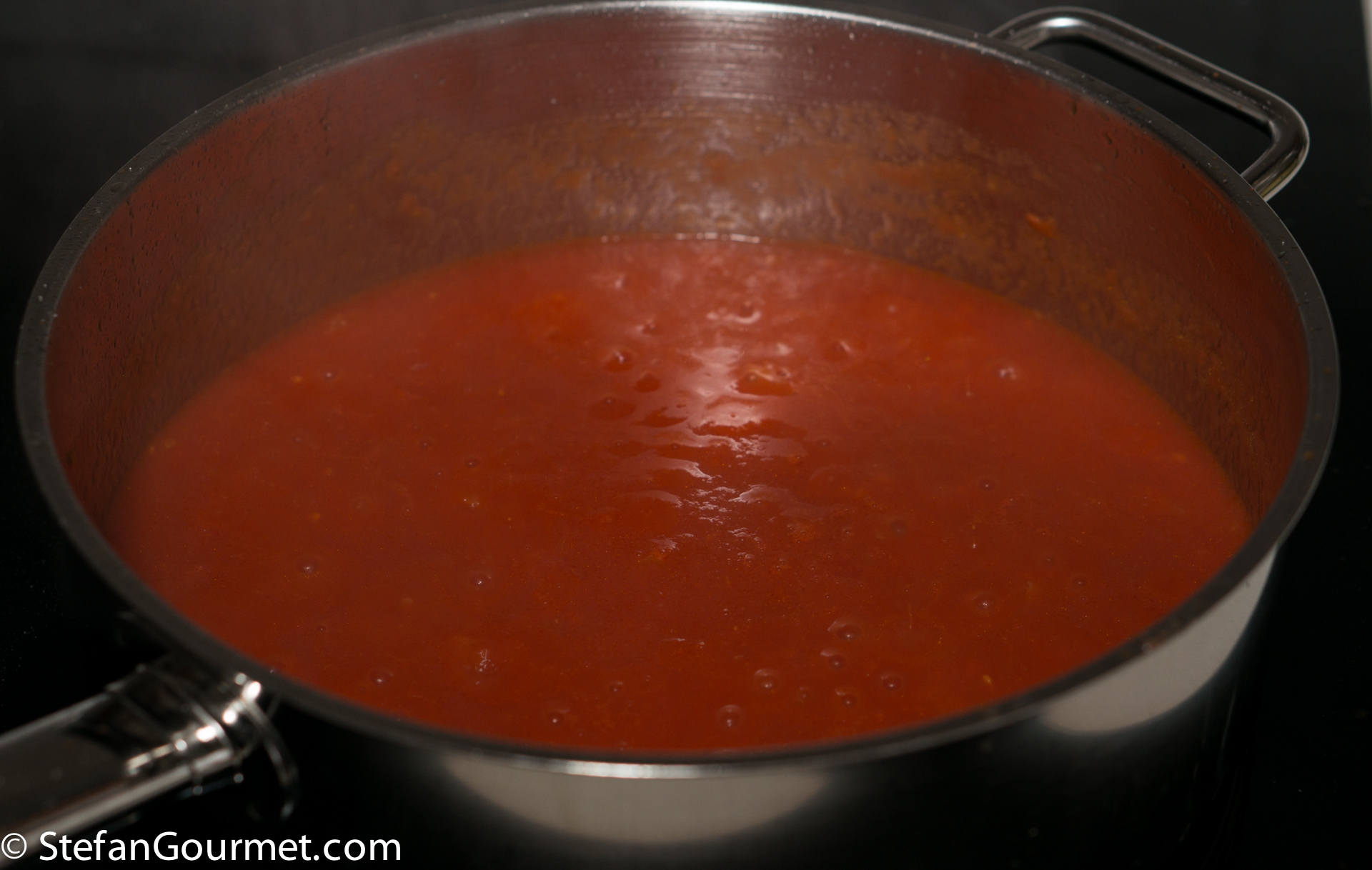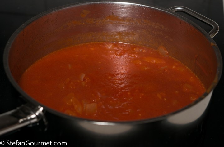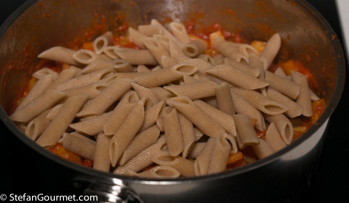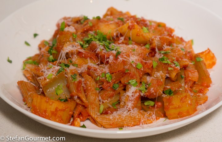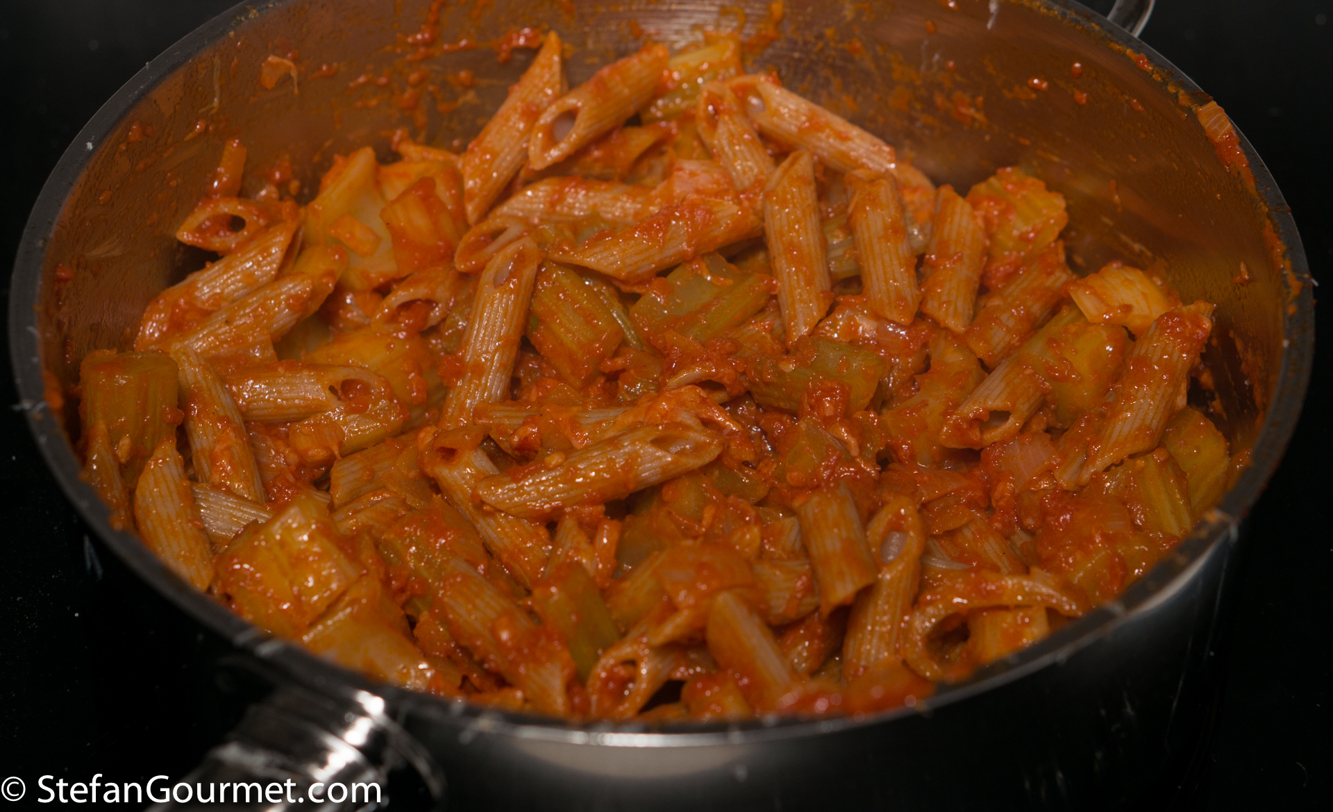 I prepared this dish a couple of months ago and neglected to blog about it. Although Stefano presented it as a summer dish, it is great for autumn as well. Celery is often used in Italian cooking together with onions and carrots, but in this dish it shines on its own. Celery is braised in a tomato sauce, and then served as a side dish on its own, or over pasta. I did the latter. Kees usually likes all the food I cook, but in this case (as I could have expected, because I know he hates celery) he refused to eat it. But if you like celery, this is really nice. The celery needs to be braised until it is tender, which can take quite a while. The reason for that is that the acidity of the tomatoes actually keeps the celery firm. For a shorter cooking time, you could first blanch the celery in water with a bit of baking soda. Baking soda is alkaline and has the opposite effect of acid on cooking the celery.