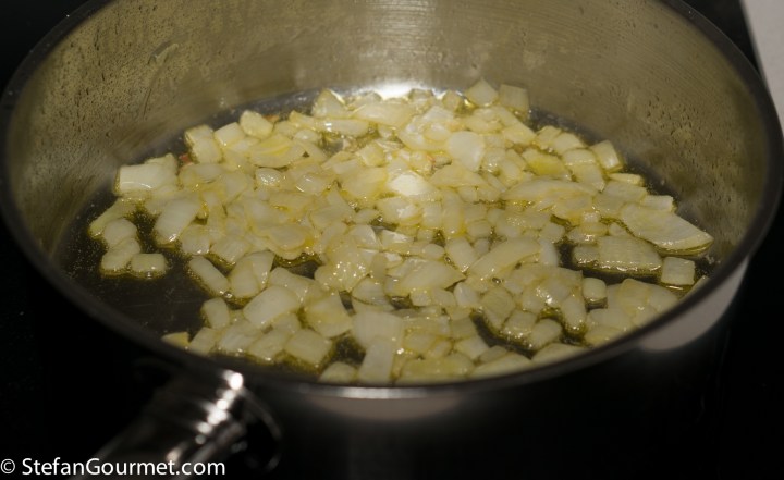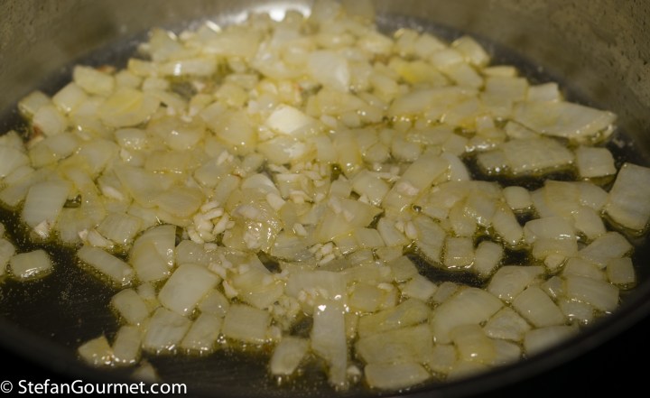 …until the onion is soft and fragrant. Then add the minced garlic, and stir for another minute, making sure not to allow the garlic to brown (which would make it bitter).