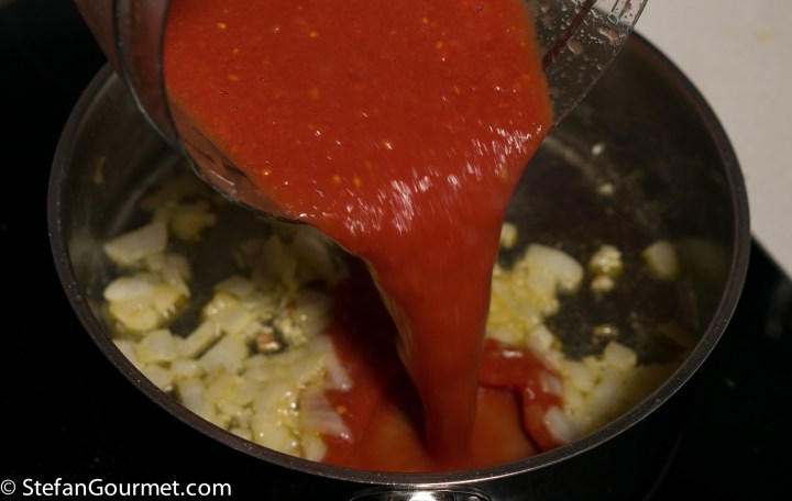 Puree the can of tomatoes in the food processor, and add to the onions.