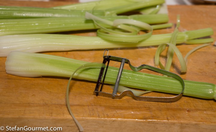 While the tomato sauce is simmering, peel away and discard the tough fibers on the outside of the celery.