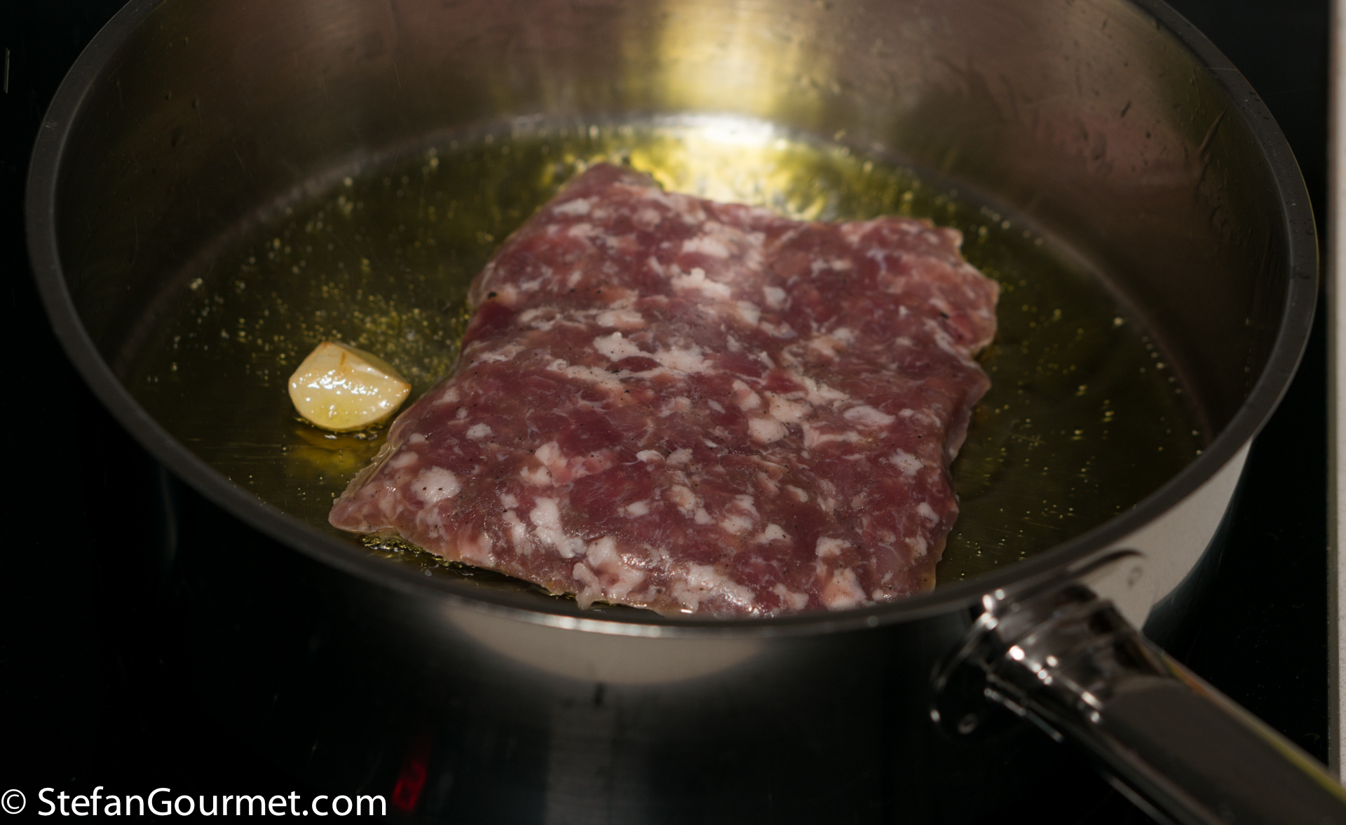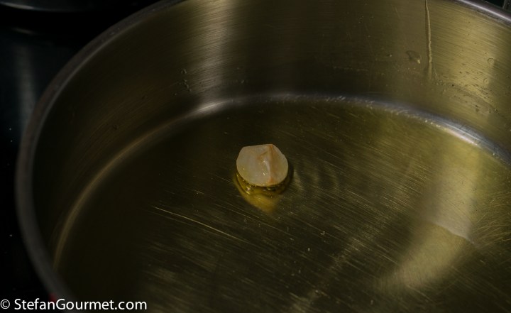 In the meantime, heat the olive oil in a frying pan and add the garlic clove. Cook over medium heat until the garlic is golden. As the goal is to infuse the oil with garlic, it helps to tilt the pan.