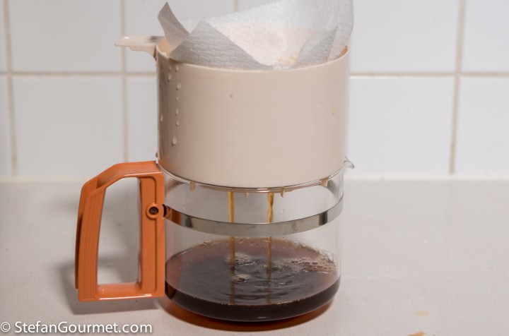 Take the mushrooms out of the soaking liquid and reserve. Filter the mushroom soaking liquid through a paper towel.