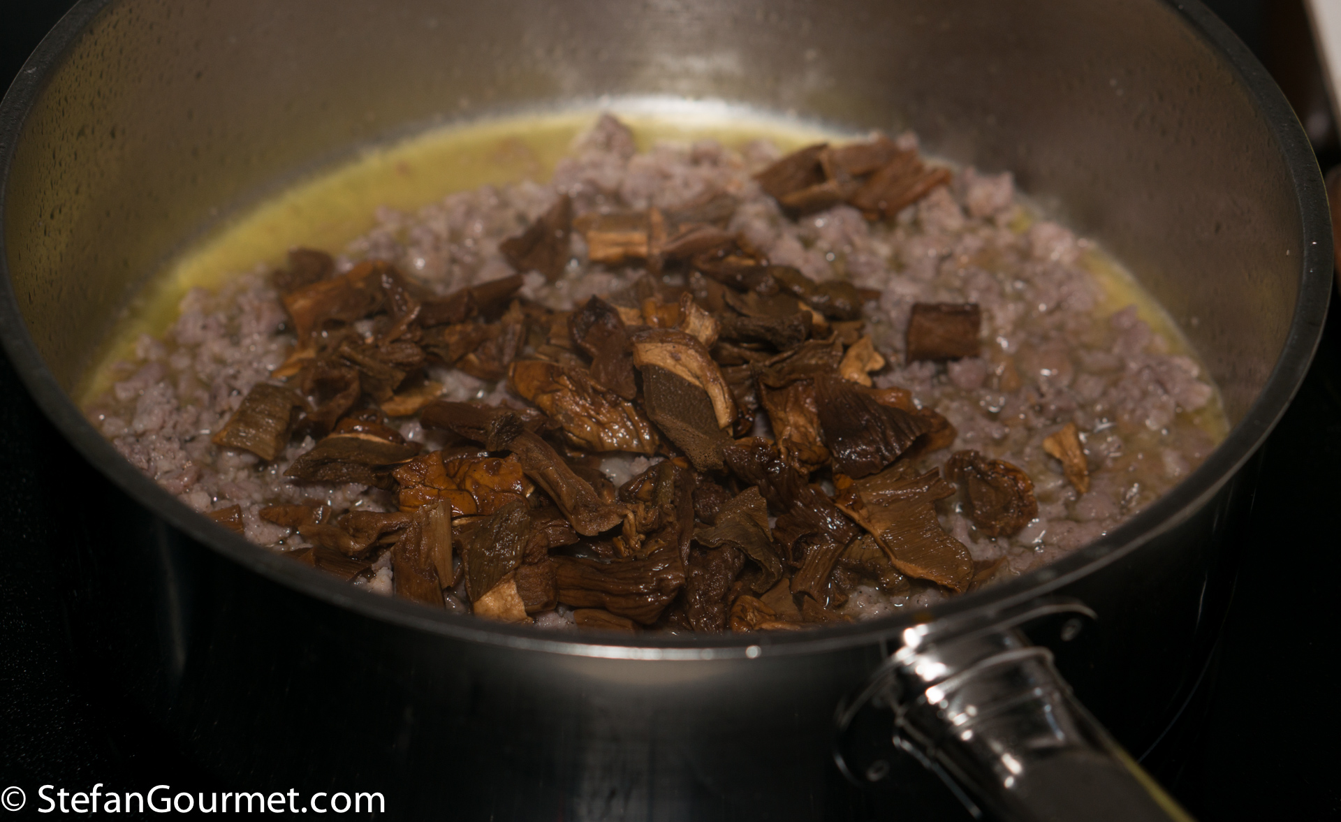 Put the dried porcini mushrooms in a bowl and cover with boiling water. Allow to soak for 10 minutes.