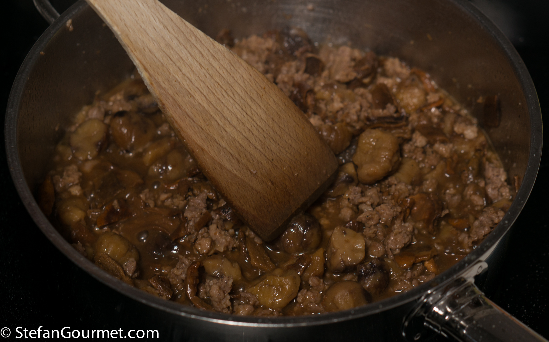 Cook the sausage meat over medium-high heat, breaking it up with wooden spatulas…