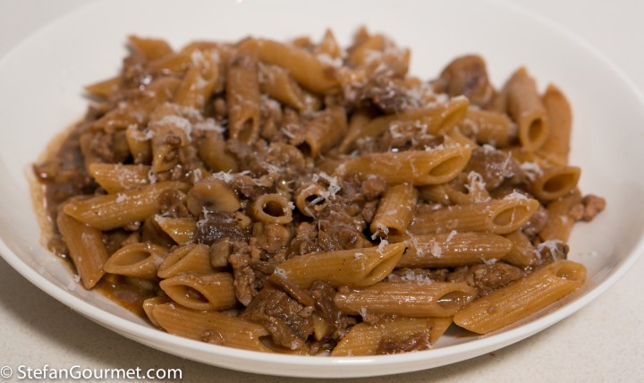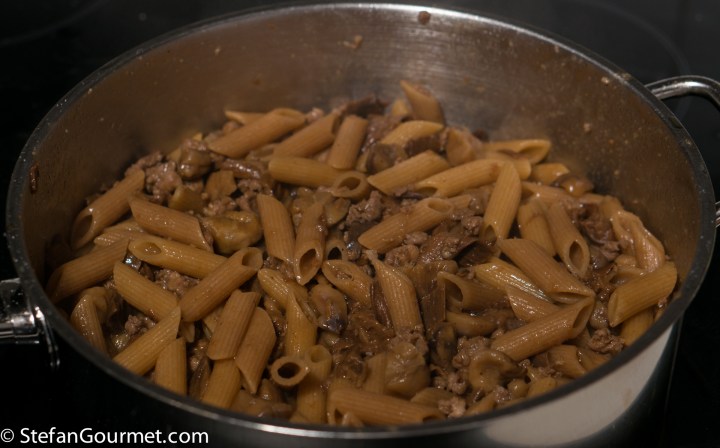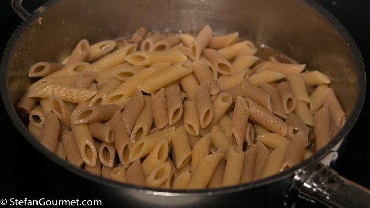 When I prepare pasta dishes I often cheat a little, because in Italy it is most often a primo piatto that has a high ratio of pasta to ‘sauce’ or whatever is served with the pasta. That is fine if the primo is followed by a secondo (meat or fish) with contorni (vegetable side), but if you are just having the pasta than it is not really a full meal as the amount of protein and vegetables is too low. Although I often serve both primo and secondo even for weekday meals, just as often I ‘cheat’ and double the amount of meat and/or vegetables that go into a pasta dish to turn it into a full meal (piatto unico). As in this case, where I used Paola’s amounts for 4 people, served with pasta for 2. So if you want to make this more Italian, double the amount of pasta and serve to 4, or halve the amount of other ingredients for 2.